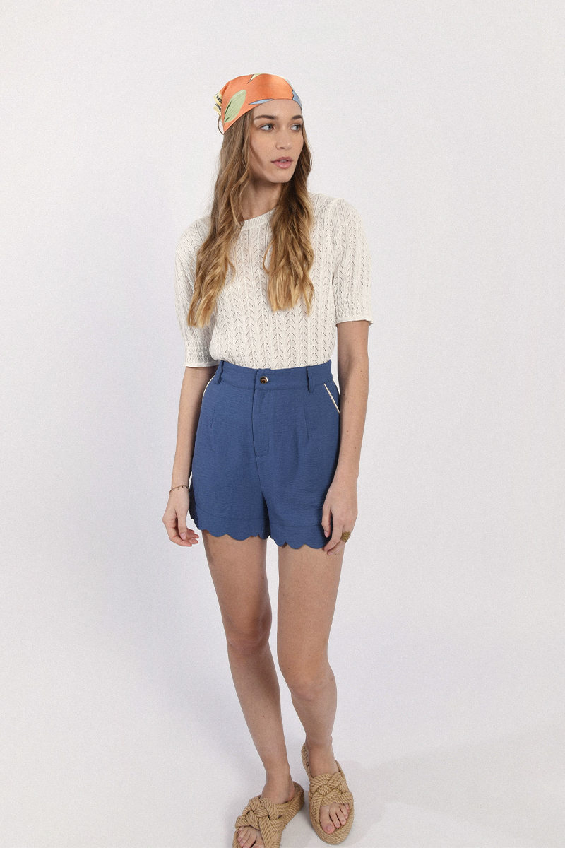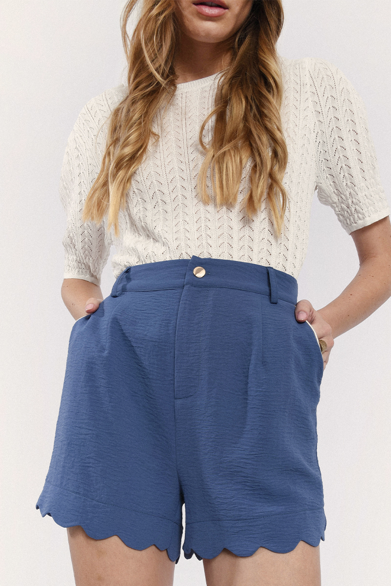 Κομψό γυναικείο σορτς σε μπλε απόχρωση με ιδιαίτερο τελείωμα που προσθέτει μοντέρνο και ξεχωριστό χαρακτήρα. Άνετη εφαρμογή, ιδανικό για καθημερινές εμφανίσεις και casual chic looks. Συνδυάζεται εύκολα με T-shirt, μπλούζες ή τοπ για ολοκληρωμένο και στυλάτο outfit.