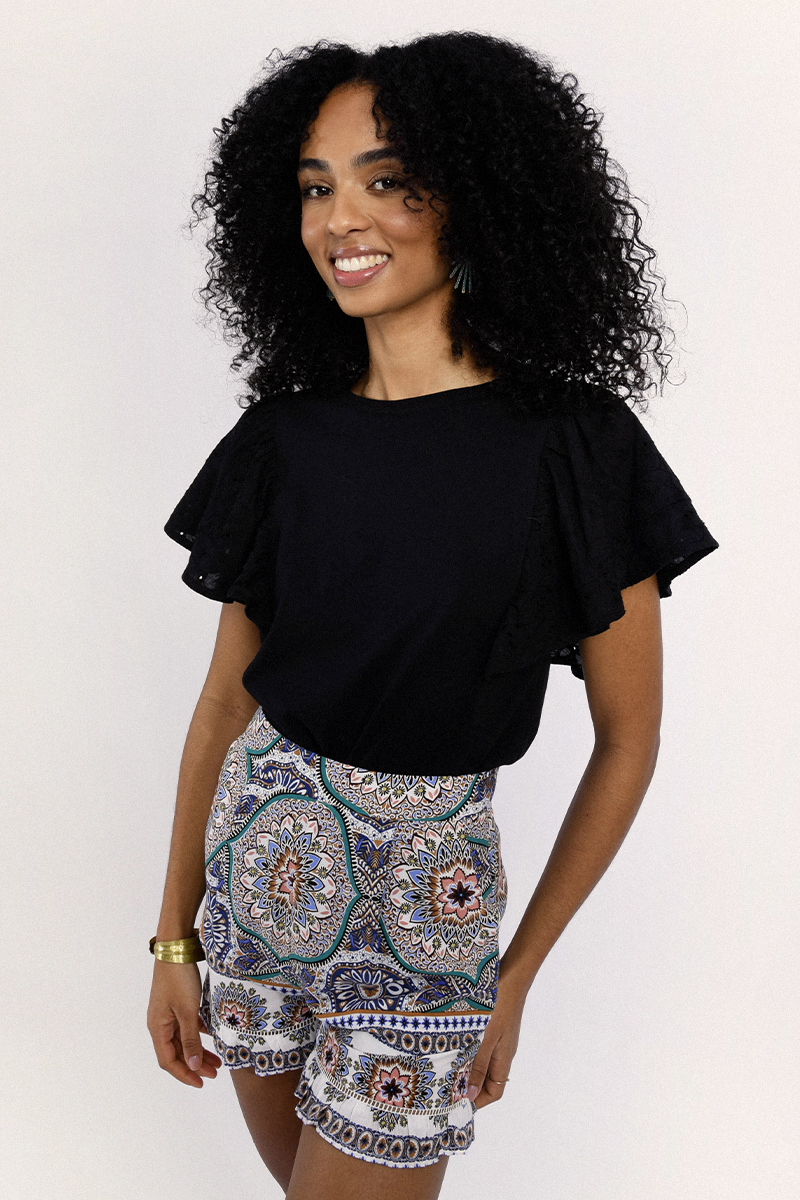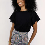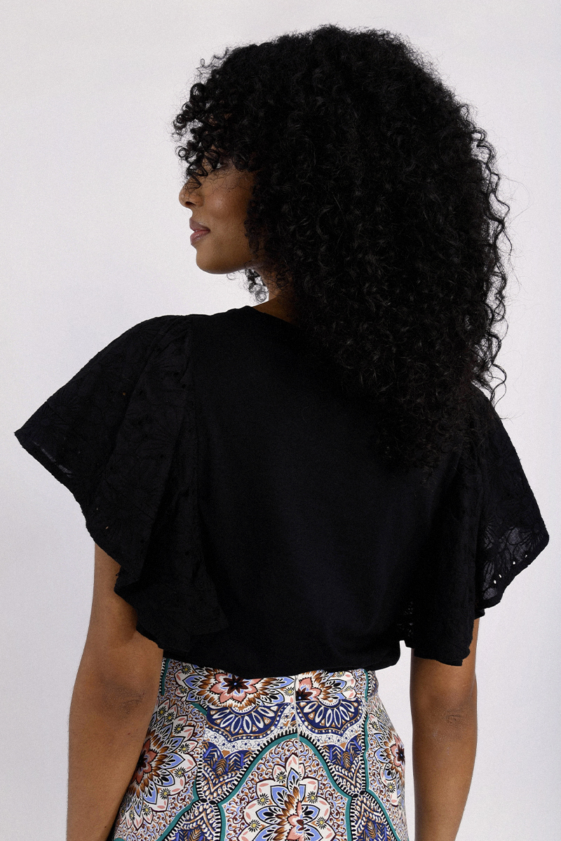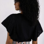 Κομψό γυναικείο T-shirt σε μαύρη απόχρωση με εντυπωσιακά μανίκια που χαρίζουν θηλυκότητα και μοντέρνο χαρακτήρα. Άνετη εφαρμογή, ιδανικό για καθημερινές εμφανίσεις ή casual chic looks. Συνδυάζεται εύκολα με τζιν, φούστες ή παντελόνια για ολοκληρωμένο και στυλάτο outfit.