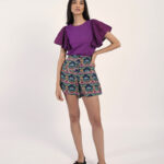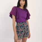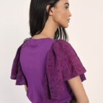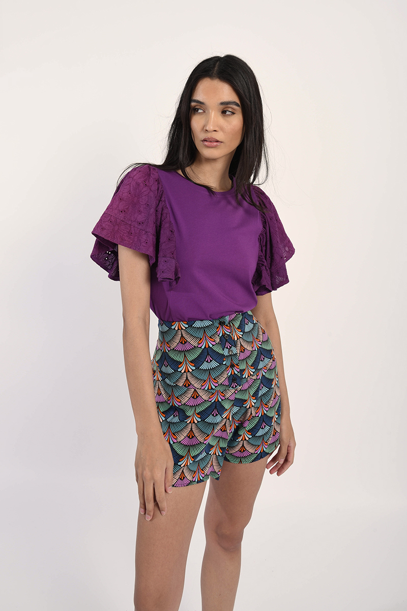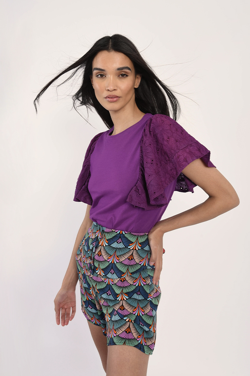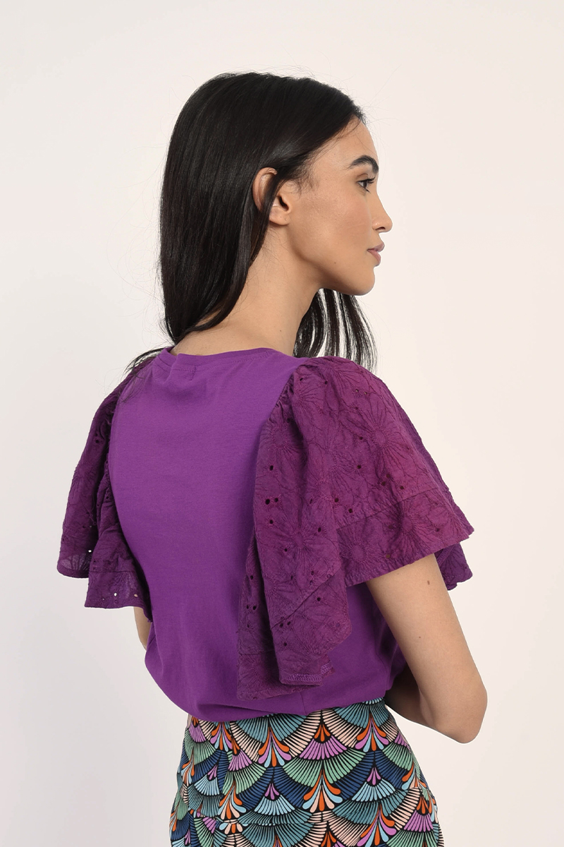 Κομψό γυναικείο T-shirt σε μωβ απόχρωση με εντυπωσιακά μανίκια που προσθέτουν μοντέρνο και ιδιαίτερο χαρακτήρα. Άνετη εφαρμογή, ιδανικό για καθημερινές εμφανίσεις ή casual chic looks. Συνδυάζεται εύκολα με τζιν, φούστες ή παντελόνια για ολοκληρωμένο και στυλάτο outfit.