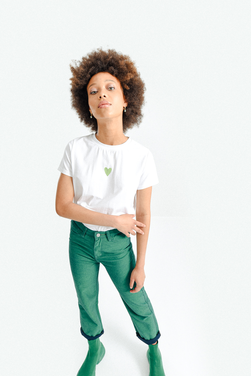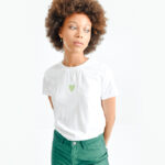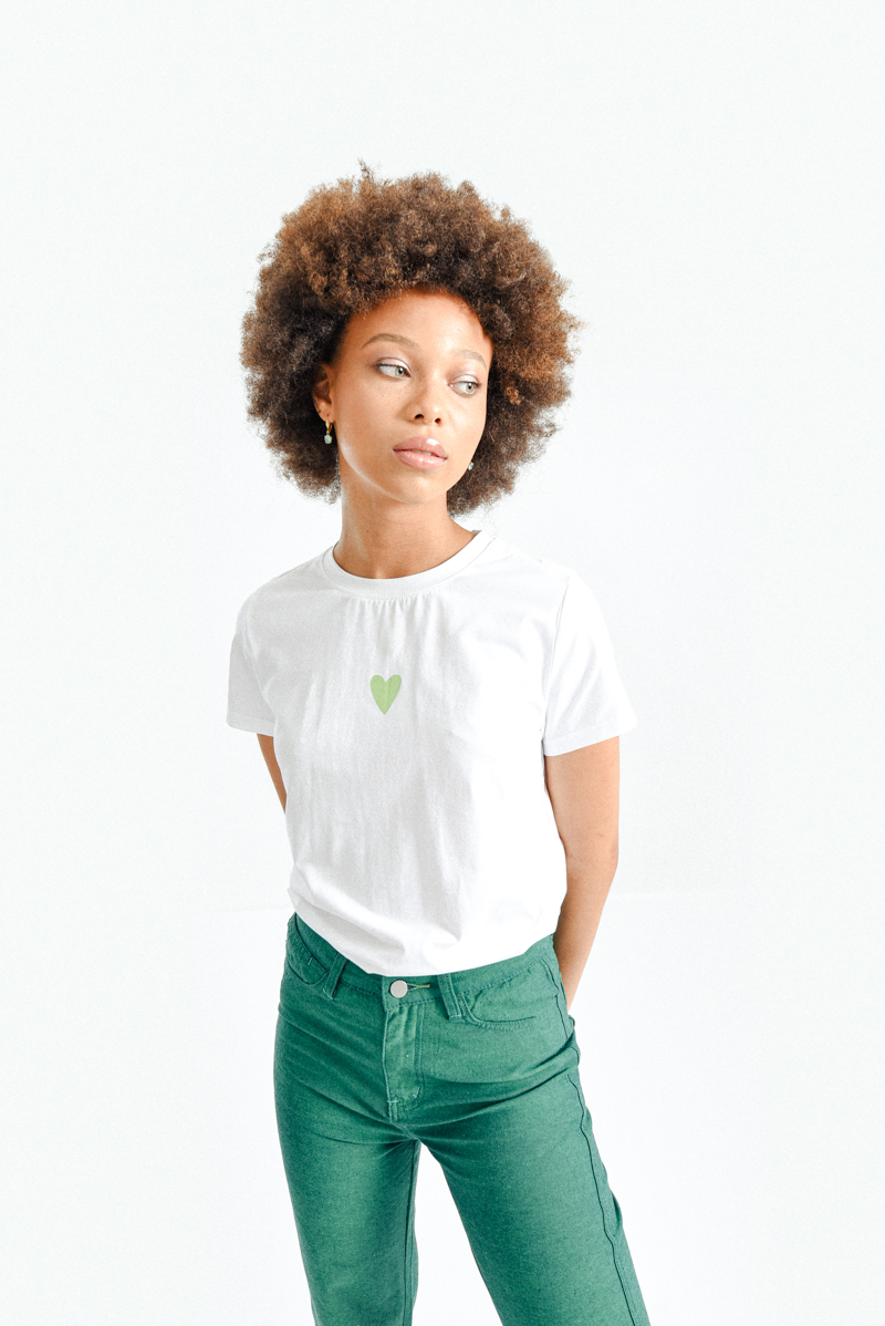 Λευκό γυναικείο t-shirt με πράσινη καρδιά στο μπροστινό μέρος, απλό και χαριτωμένο. Άνετο και ευκολοφόρετο, ιδανικό για καθημερινές εμφανίσεις. Προσθέτει μια φρέσκια πινελιά χρώματος στο casual στυλ σου.