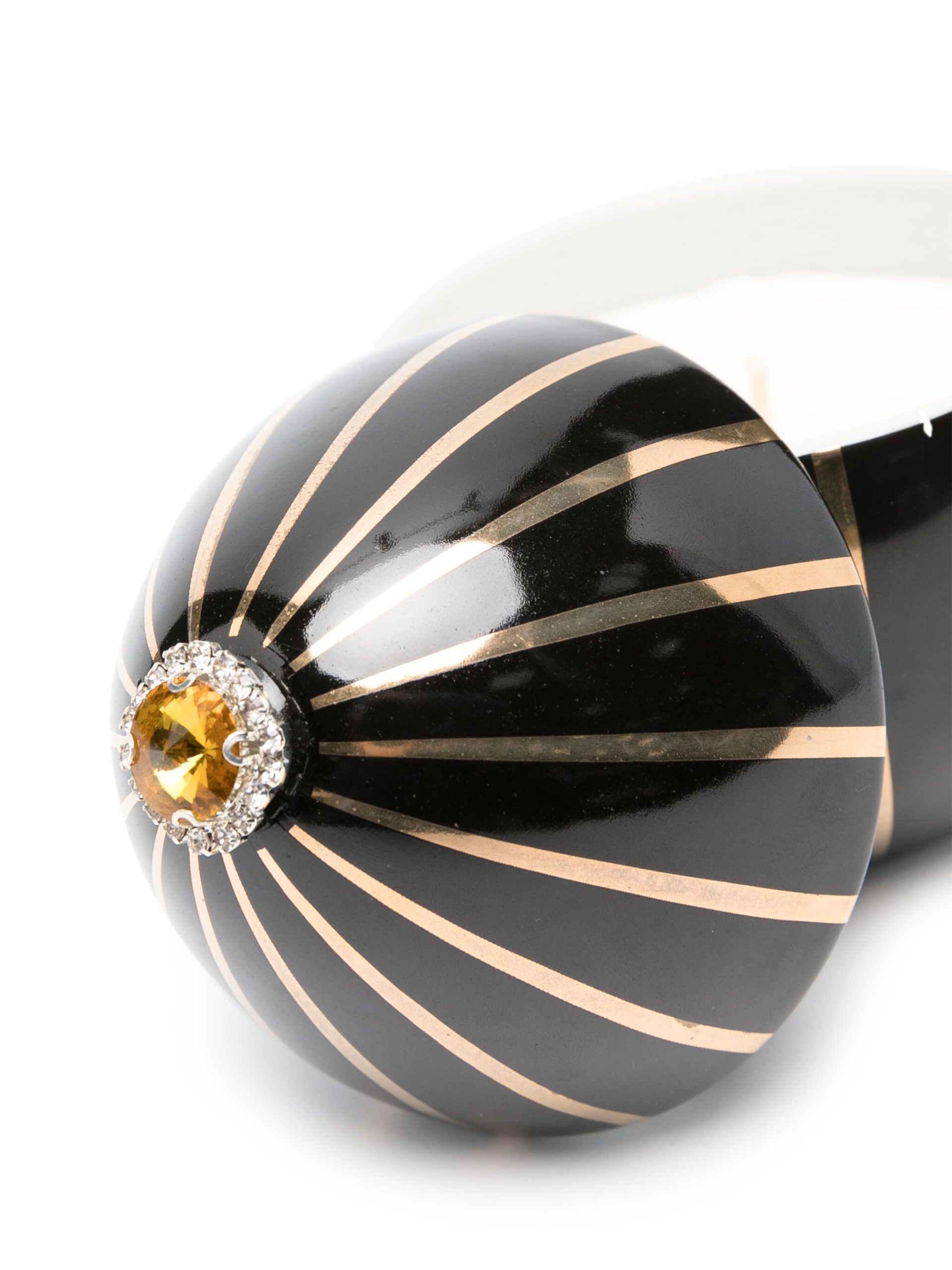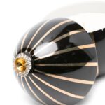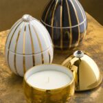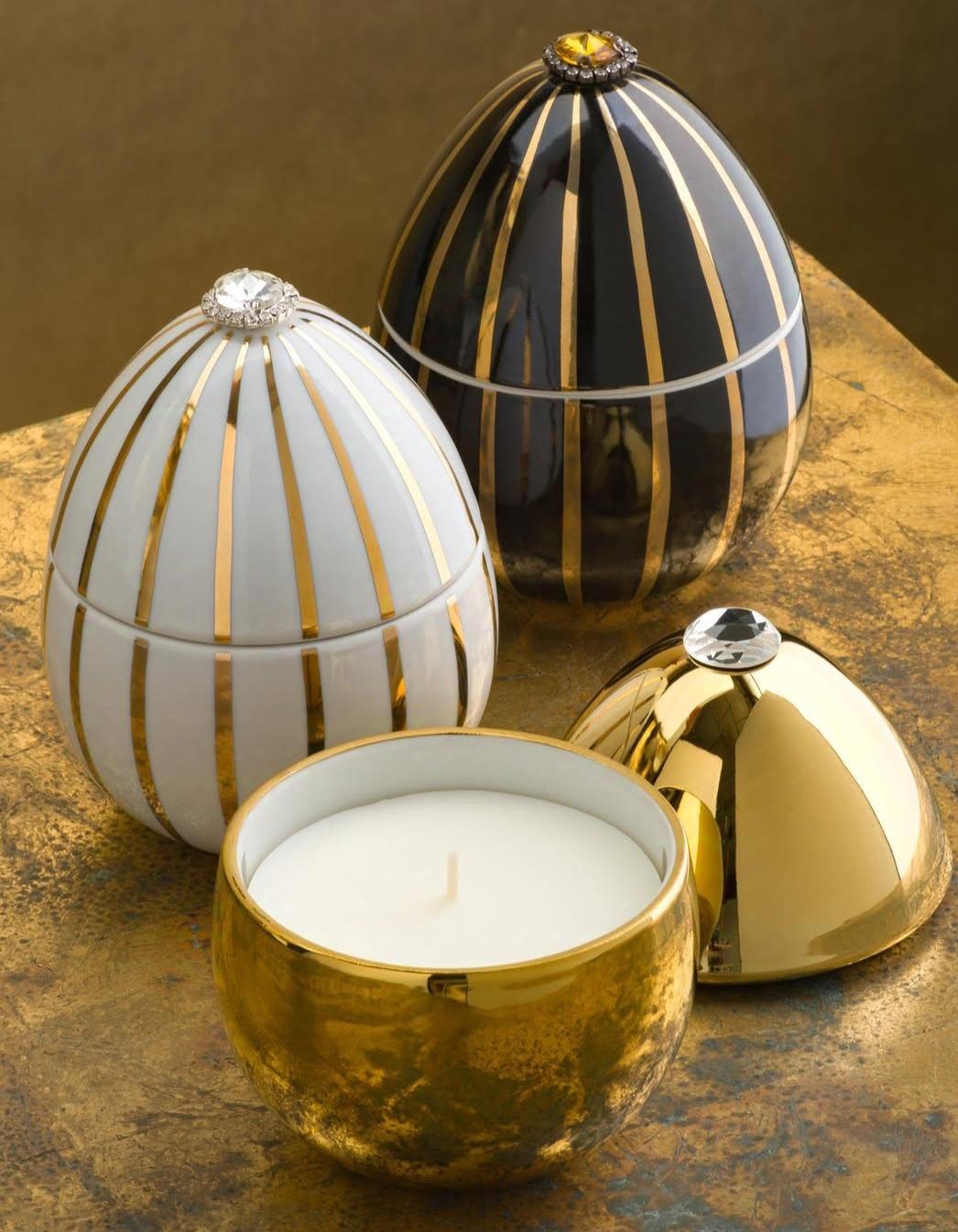 Ένα αρωματικό κερί σε σχέδιο μαύρου αυγού με χρυσές ρίγες. Κατασκευασμένο από κεραμικό υλικό και ζωγραφισμένο στο χέρι με χρυσό 18 καρατίων και στρας, αποτελεί ένα πραγματικό διακοσμητικό κόσμημα που προσφέρει ένα μοναδικό άρωμα.