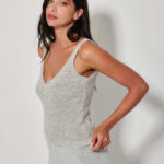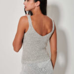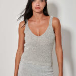 Γυναικείο ασημί πλεκτό καλοκαιρινό τοπ που χαρίζει κομψό και διακριτικά λαμπερό χαρακτήρα στο ντύσιμο. Ιδανικό για casual ή βραδινές εμφανίσεις, φοριέται άνετα με φούστες, παντελόνια ή σορτς, δημιουργώντας ένα ολοκληρωμένο και προσεγμένο καλοκαιρινό σύνολο.