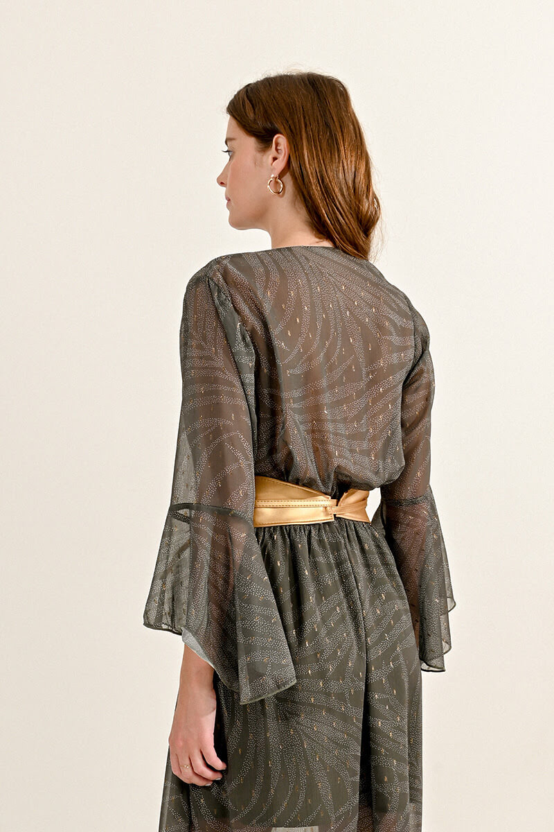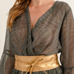 Γυναικεία ζώνη σε χρυσή απόχρωση, κομψή και εντυπωσιακή. Ιδανική για να δώσει στυλ και λάμψη σε φορέματα ή παντελόνια. Προσφέρει μοντέρνο και διαχρονικό αξεσουάρ για κάθε outfit.
