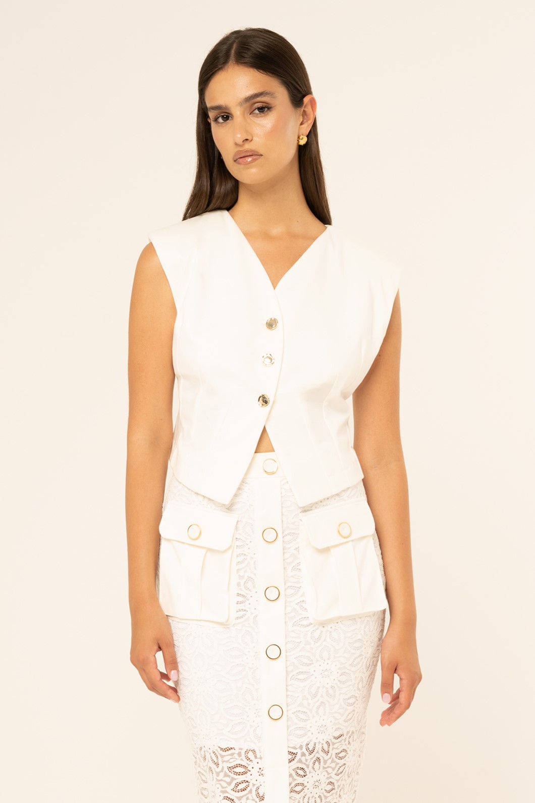 Αυτή η λευκή μπλούζα-γιλέκο ξεχωρίζει με τη σειρά κουμπιών στο μπροστινό μέρος, προσφέροντας κομψή και θηλυκή λεπτομέρεια. Με άνετη γραμμή που αγκαλιάζει διακριτικά τη σιλουέτα, είναι ιδανική για layering ή standalone εμφανίσεις, συνδυάζοντας άνεση, φινέτσα και κομψότητα σε κάθε περίσταση.