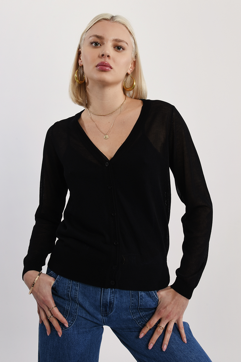 Κομψή γυναικεία ζακέτα σε μαύρη απόχρωση, ιδανική για καθημερινές εμφανίσεις. Άνετη εφαρμογή και ευκολοφόρετο σχέδιο που συνδυάζεται εύκολα με τζιν, παντελόνια ή φούστες για ένα ολοκληρωμένο casual ή πιο προσεγμένο look.