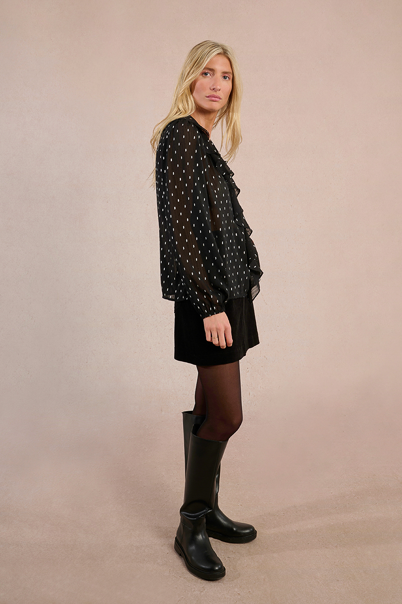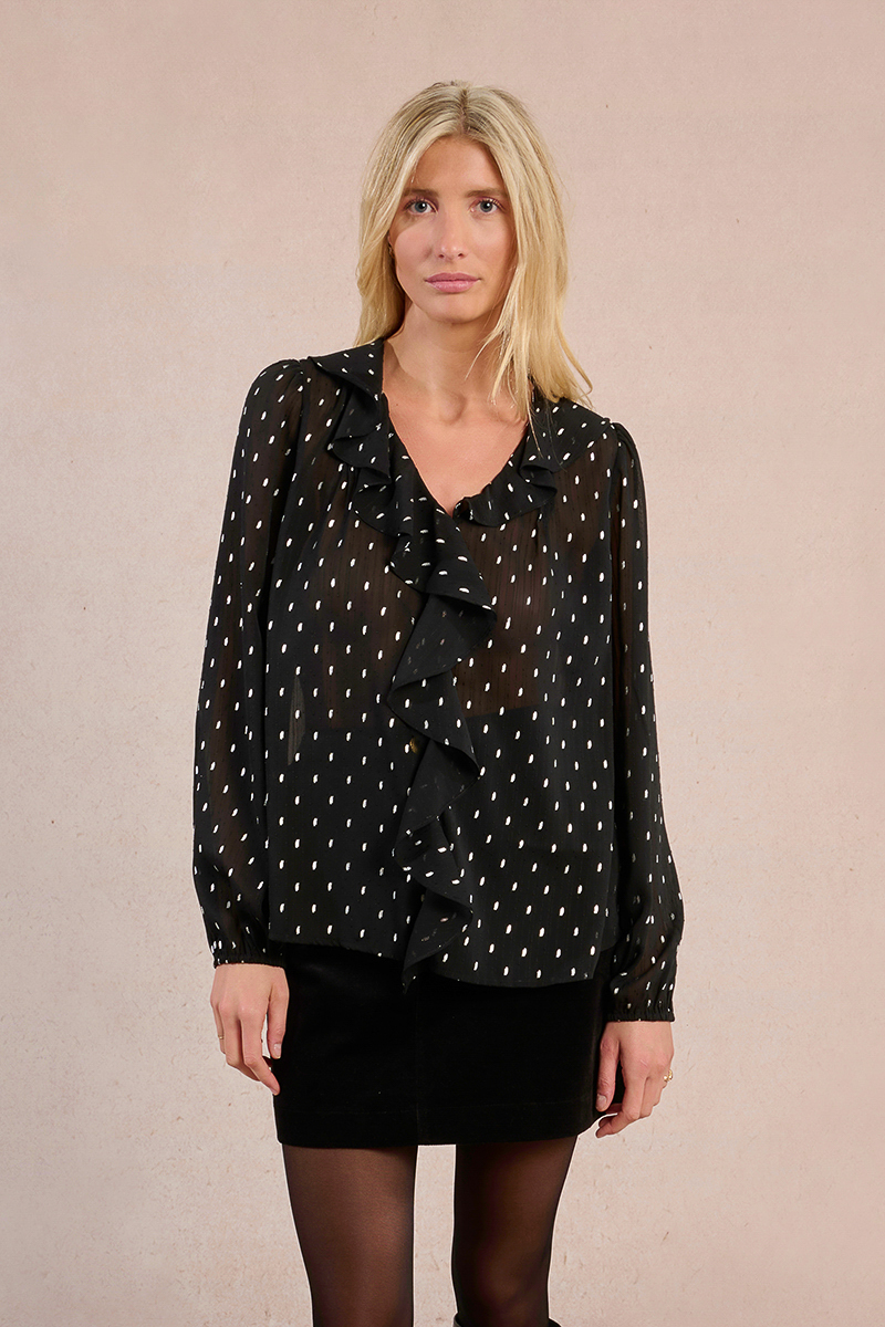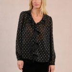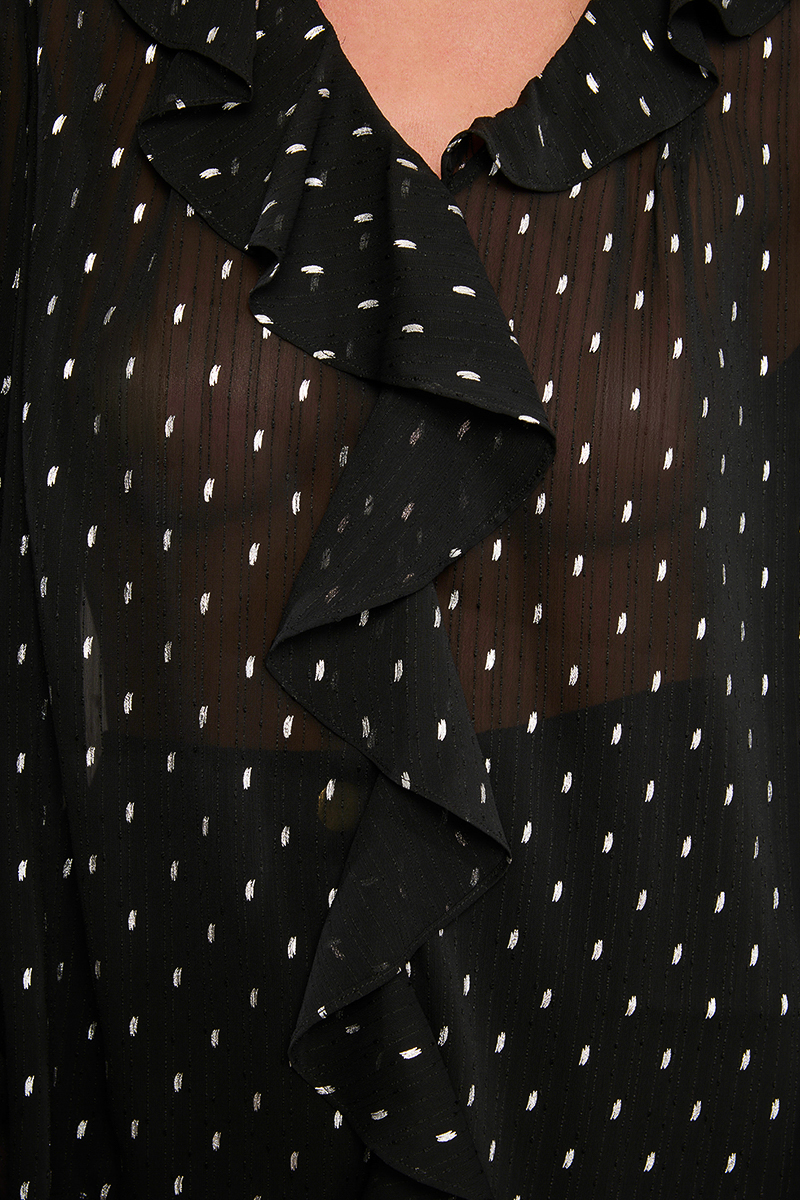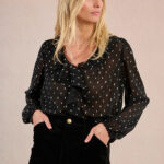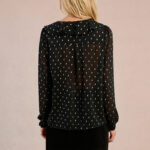 Μαύρη ημιδιάφανη γυναικεία μπλούζα με ξεχωριστό σχέδιο που προσθέτει κομψότητα και μοντέρνο χαρακτήρα στο look. Άνετη και ευκολοφόρετη, ιδανική για casual ή βραδινές εμφανίσεις. Συνδυάζεται εύκολα με φούστες, παντελόνια ή τζιν για ολοκληρωμένο και στυλάτο outfit.