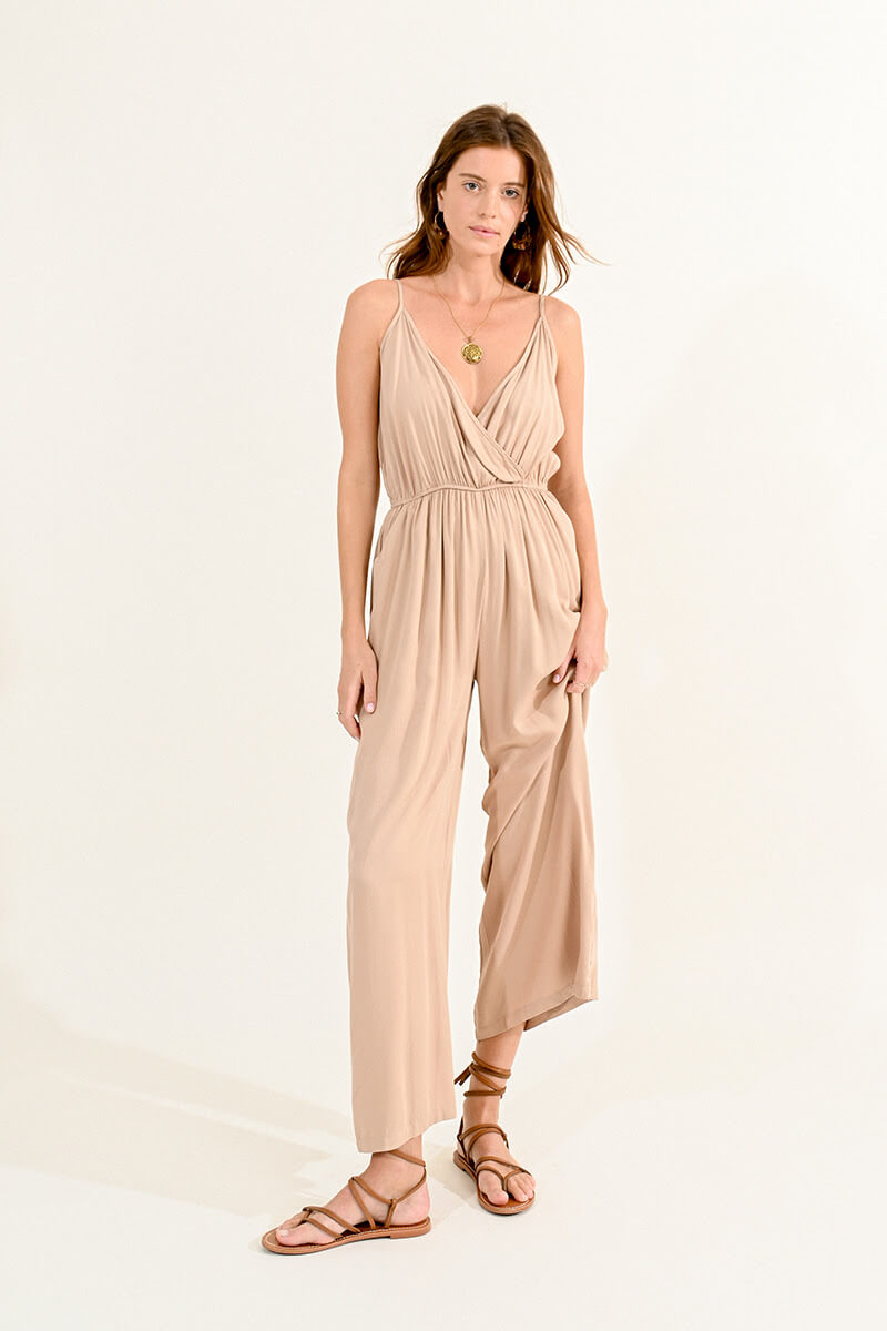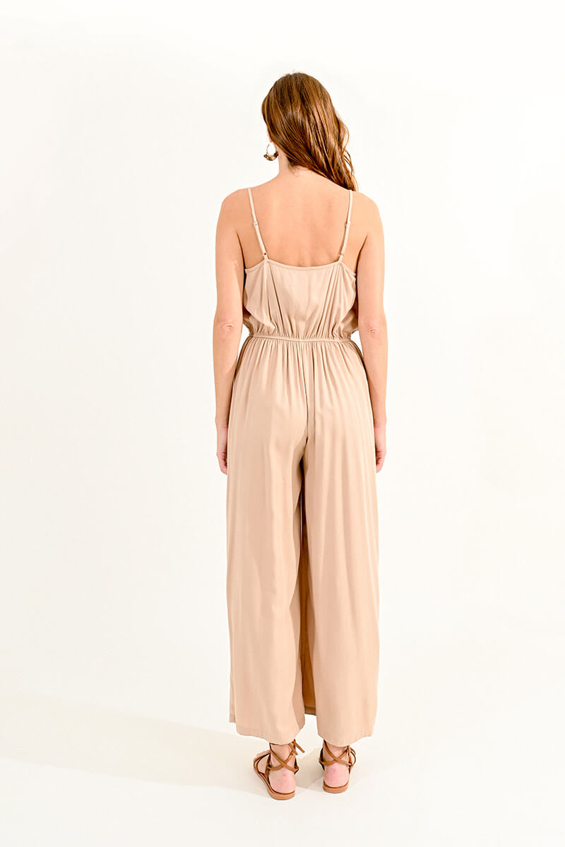 Γυναικεία ολόσωμη φόρμα σε μπεζ απόχρωση, κομψή και ευκολοφόρετη. Προσφέρει άνετη εφαρμογή και μοντέρνο στυλ για καθημερινές αλλά και πιο προσεγμένες εμφανίσεις. Συνδυάζεται εύκολα με sneakers ή πέδιλα για ολοκληρωμένο look.