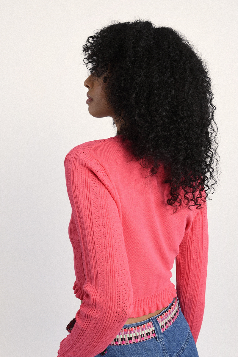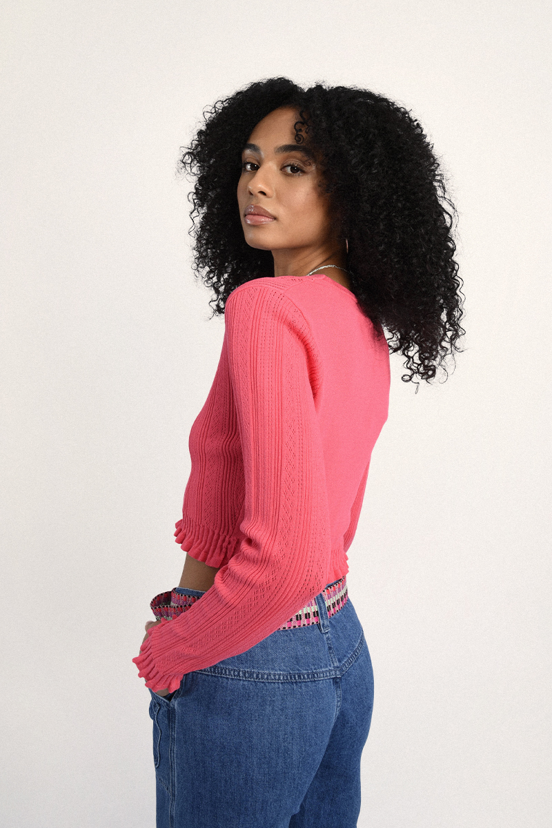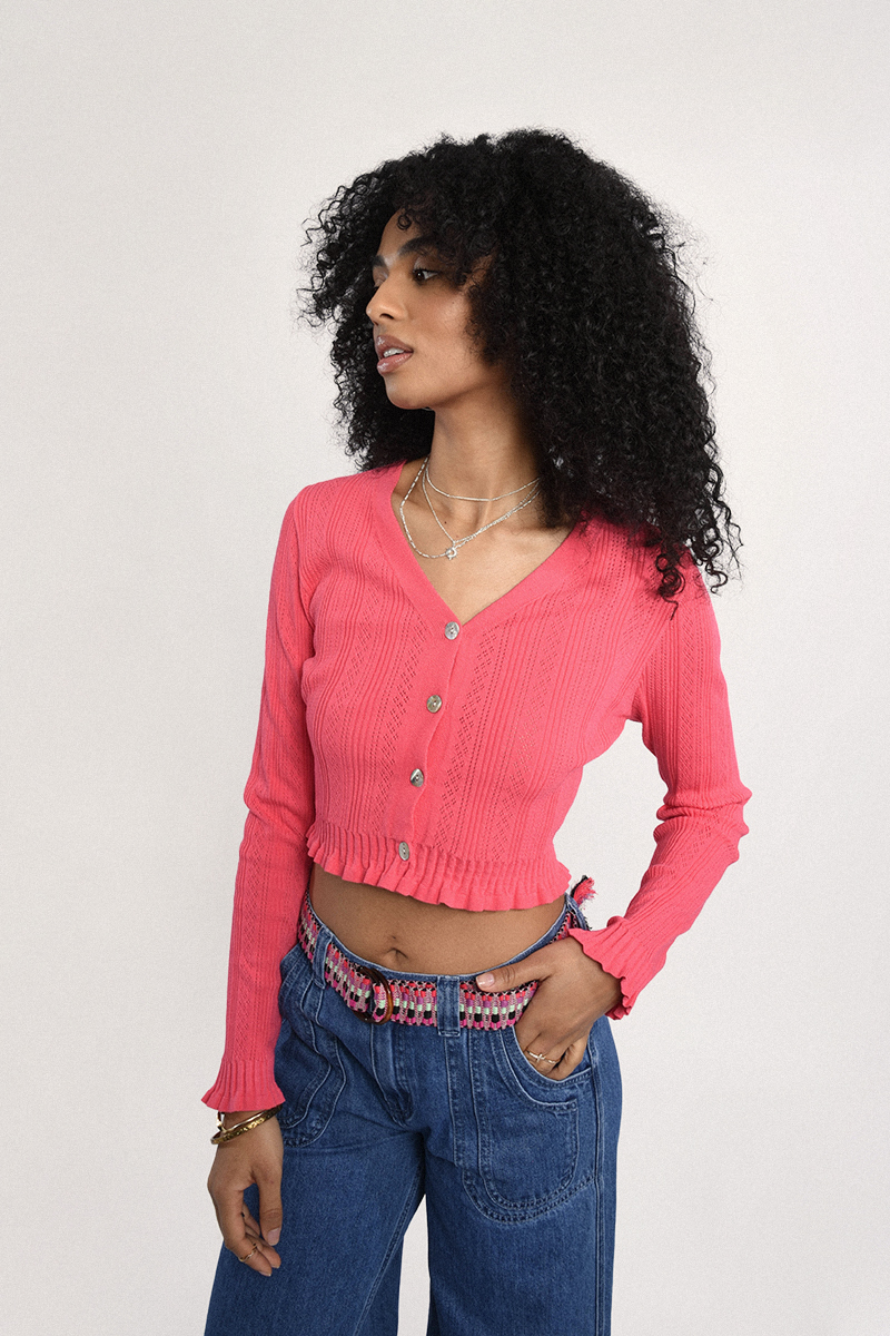 Γυναικεία ζακέτα σε ροζ απόχρωση, ιδανική για καθημερινές εμφανίσεις με κομψό και θηλυκό χαρακτήρα. Άνετη εφαρμογή και ευκολοφόρετο σχέδιο που συνδυάζεται εύκολα με τζιν, φούστες ή παντελόνια για ολοκληρωμένο look.