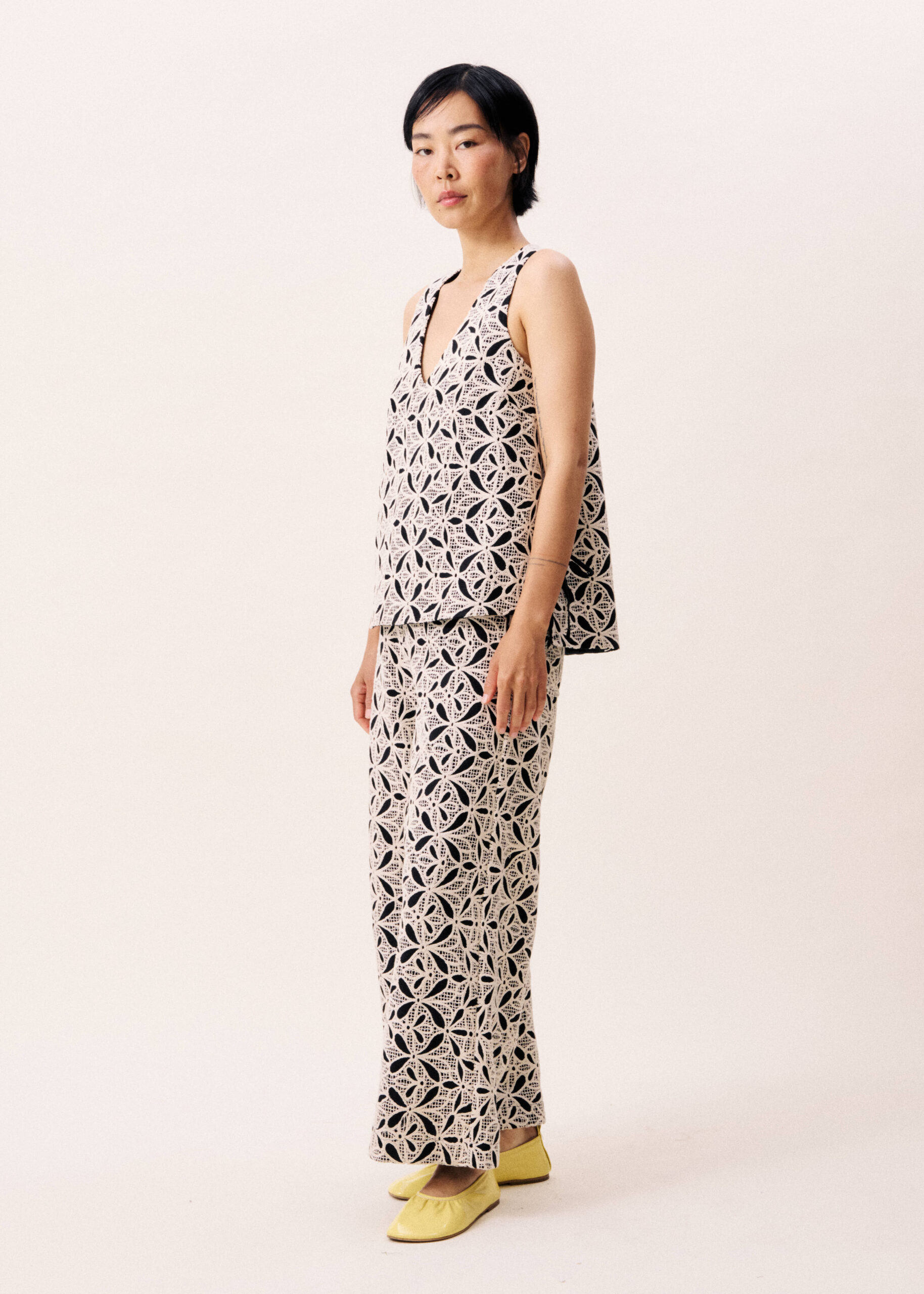 Γυναικείο ασπρόμαυρο παντελόνι διακοσμημένο με λουλούδια που χαρίζει κομψό και μοντέρνο χαρακτήρα στο ντύσιμο. Ιδανικό για casual ή πιο προσεγμένες εμφανίσεις, συνδυάζεται άνετα με μπλούζες ή πουκάμισα, δημιουργώντας ένα ολοκληρωμένο και στιλάτο σύνολο.