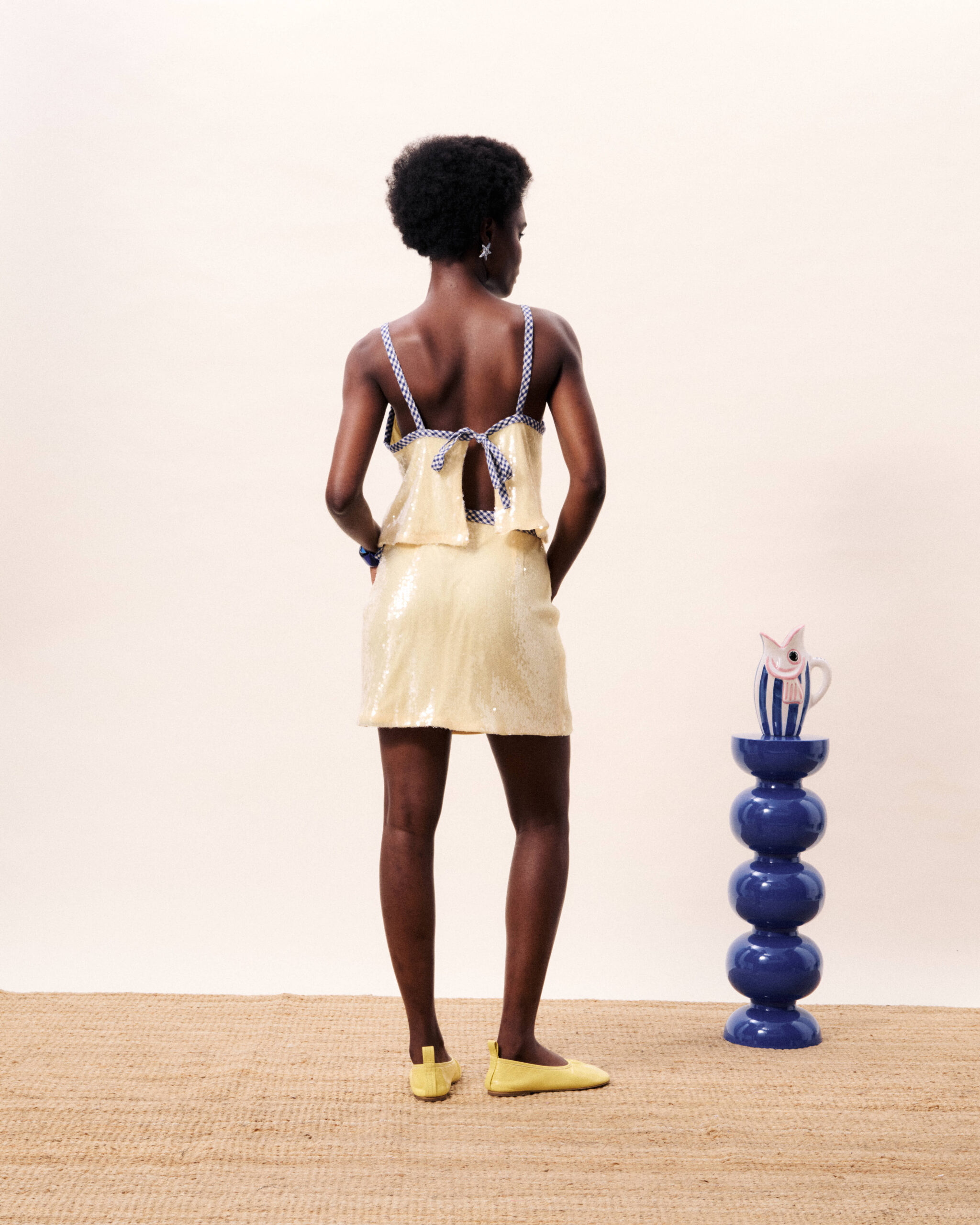 Γυναικείο κίτρινο top διακοσμημένο με παγιέτα και ανοιχτή πλάτη που χαρίζει λαμπερό και μοντέρνο χαρακτήρα στις εμφανίσεις. Ιδανικό για βραδινές ή πιο εντυπωσιακές εμφανίσεις, φοριέται άνετα με παντελόνια, φούστες ή σορτς, δημιουργώντας ένα ολοκληρωμένο και στιλάτο σύνολο.