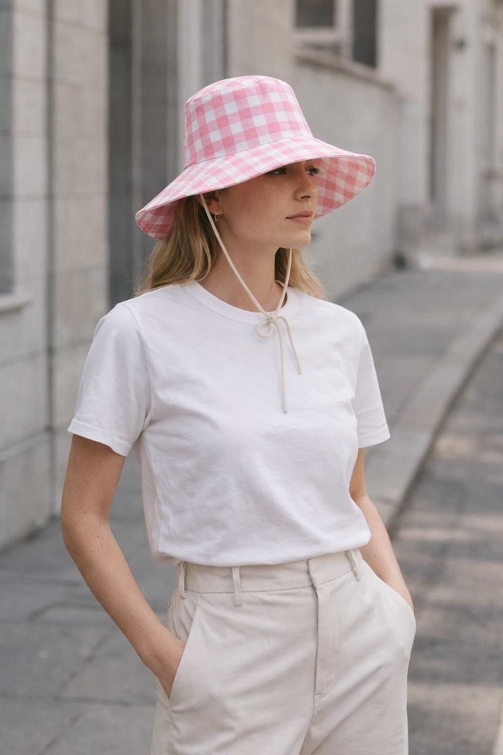 Γυναικείο καπέλο με καρό σχέδιο σε λευκό και ροζ που χαρίζει στιλάτο και καλοκαιρινό χαρακτήρα στις εμφανίσεις. Ιδανικό για καθημερινή χρήση, παραλία ή βόλτες, συνδυάζεται εύκολα με casual σύνολα και προσθέτει μία μοντέρνα πινελιά στο ντύσιμο.