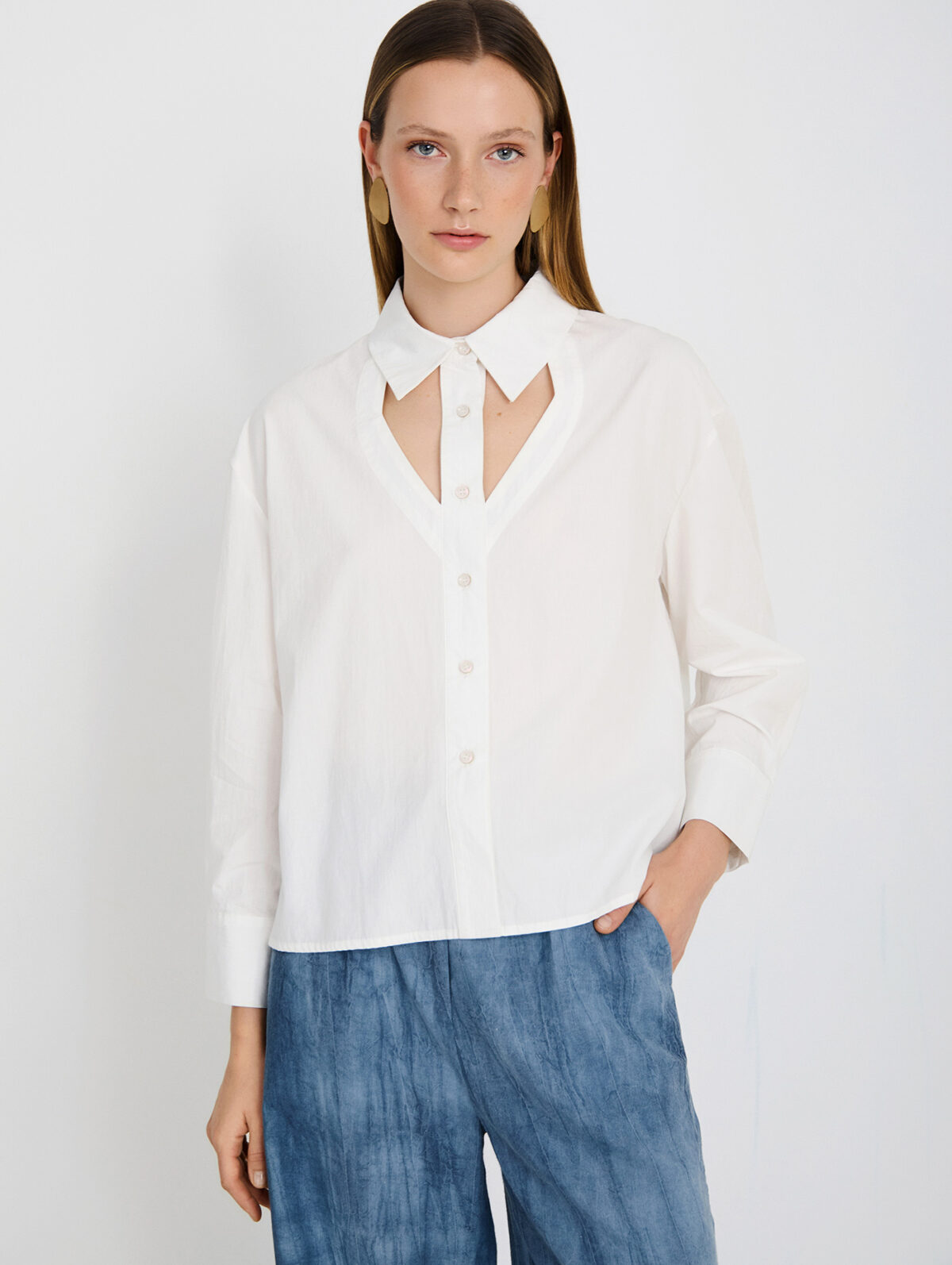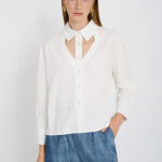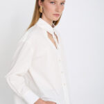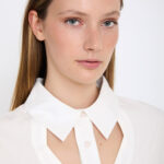 Γυναικείο λευκό μακρυμάνικο πουκάμισο με ιδιαίτερο γιακά που προσδίδει κομψό και ξεχωριστό χαρακτήρα στο ντύσιμο. Ιδανικό για επαγγελματικές αλλά και καθημερινές εμφανίσεις, συνδυάζεται εύκολα με παντελόνια, φούστες ή σακάκια, δημιουργώντας ένα ολοκληρωμένο και προσεγμένο σύνολο.