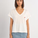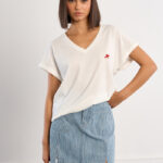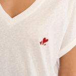Γυναικείο λευκό T-shirt με διακριτικές καρδιές στο πλάι που προσδίδει κομψό και χαριτωμένο χαρακτήρα στο καθημερινό ντύσιμο. Ιδανικό για casual εμφανίσεις, φοριέται άνετα με τζιν, σορτς ή φούστες, δημιουργώντας ένα ολοκληρωμένο και στιλάτο σύνολο.
