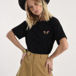 Κομψό γυναικείο T-shirt σε μαύρη απόχρωση με μικρή πεταλούδα στο στήθος που προσθέτει μοντέρνο και διακριτικό στυλ. Άνετη εφαρμογή, ιδανικό για καθημερινές εμφανίσεις και casual chic looks. Συνδυάζεται εύκολα με τζιν, φούστες ή παντελόνια για ολοκληρωμένο outfit.
