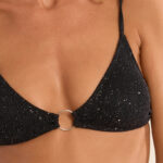 Γυναικείο μαύρο μπικίνι τοπ με διακριτικές λάμψεις και κομψό κρίκο στο μπροστινό μέρος που χαρίζει μοντέρνο και εντυπωσιακό χαρακτήρα στις καλοκαιρινές εμφανίσεις. Ιδανικό για παραλία ή πισίνα, συνδυάζεται άψογα με matching μπικίνι κάτω μέρος, δημιουργώντας ένα ολοκληρωμένο και στιλάτο σύνολο.