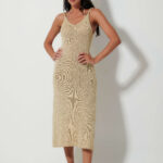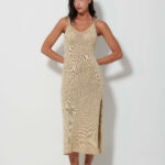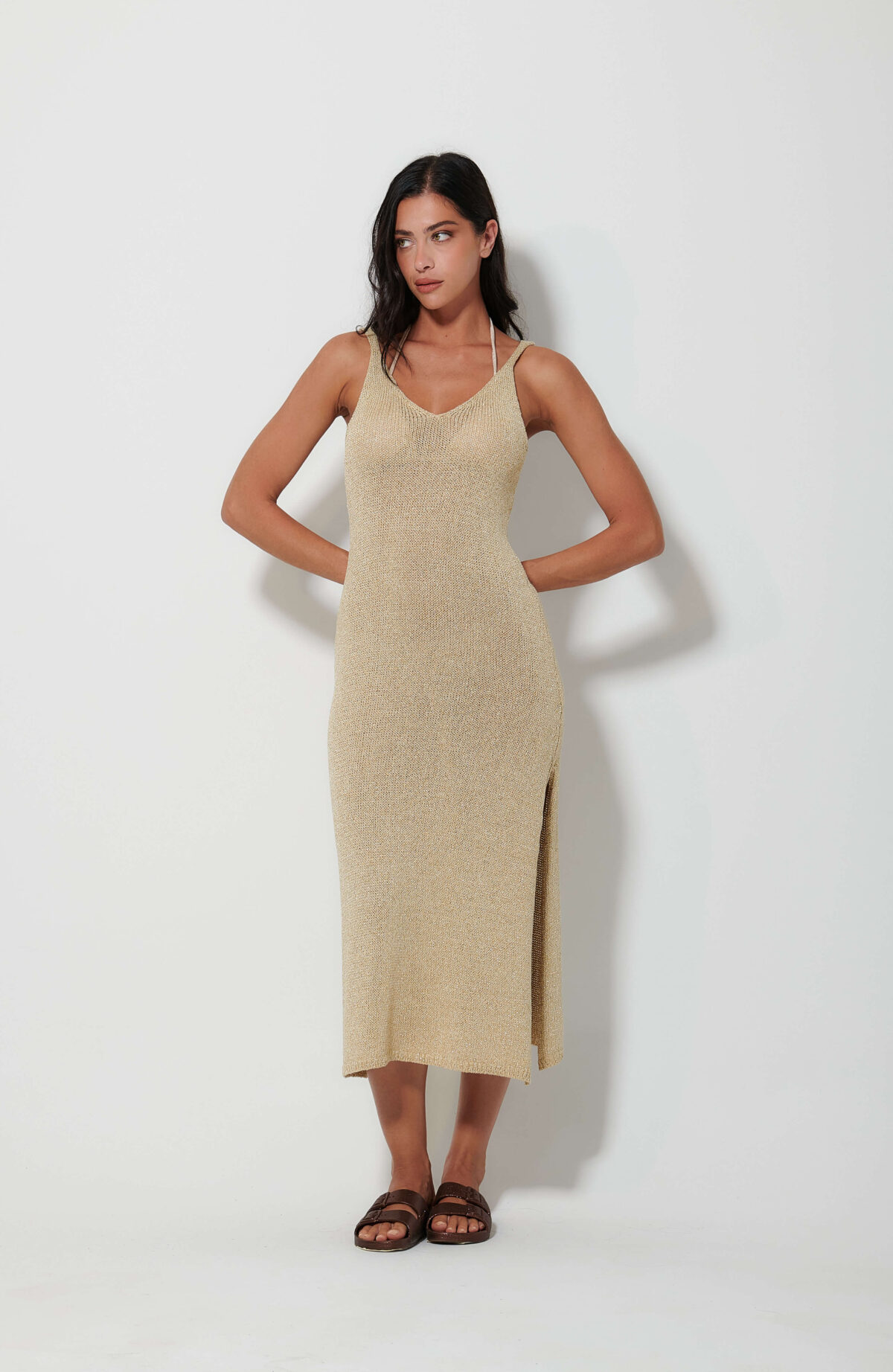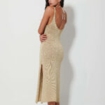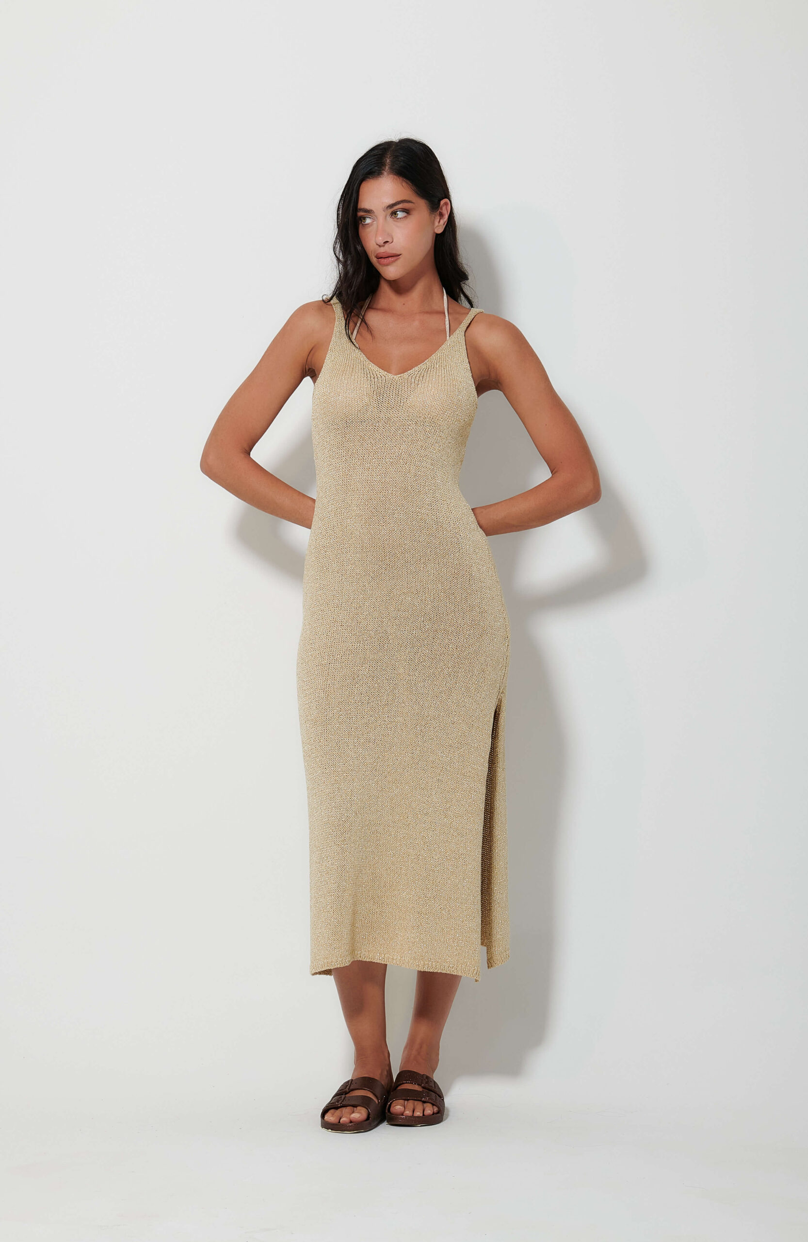 Γυναικείο χρυσό πλεκτό φόρεμα με κομψό πλάγιο άνοιγμα που προσδίδει μοντέρνο και προσεγμένο χαρακτήρα στο ντύσιμο. Ιδανικό για βραδινές ή επίσημες εμφανίσεις, φοριέται άνετα μόνο του ή με διακριτικά αξεσουάρ, δημιουργώντας ένα ολοκληρωμένο και κομψό σύνολο.
