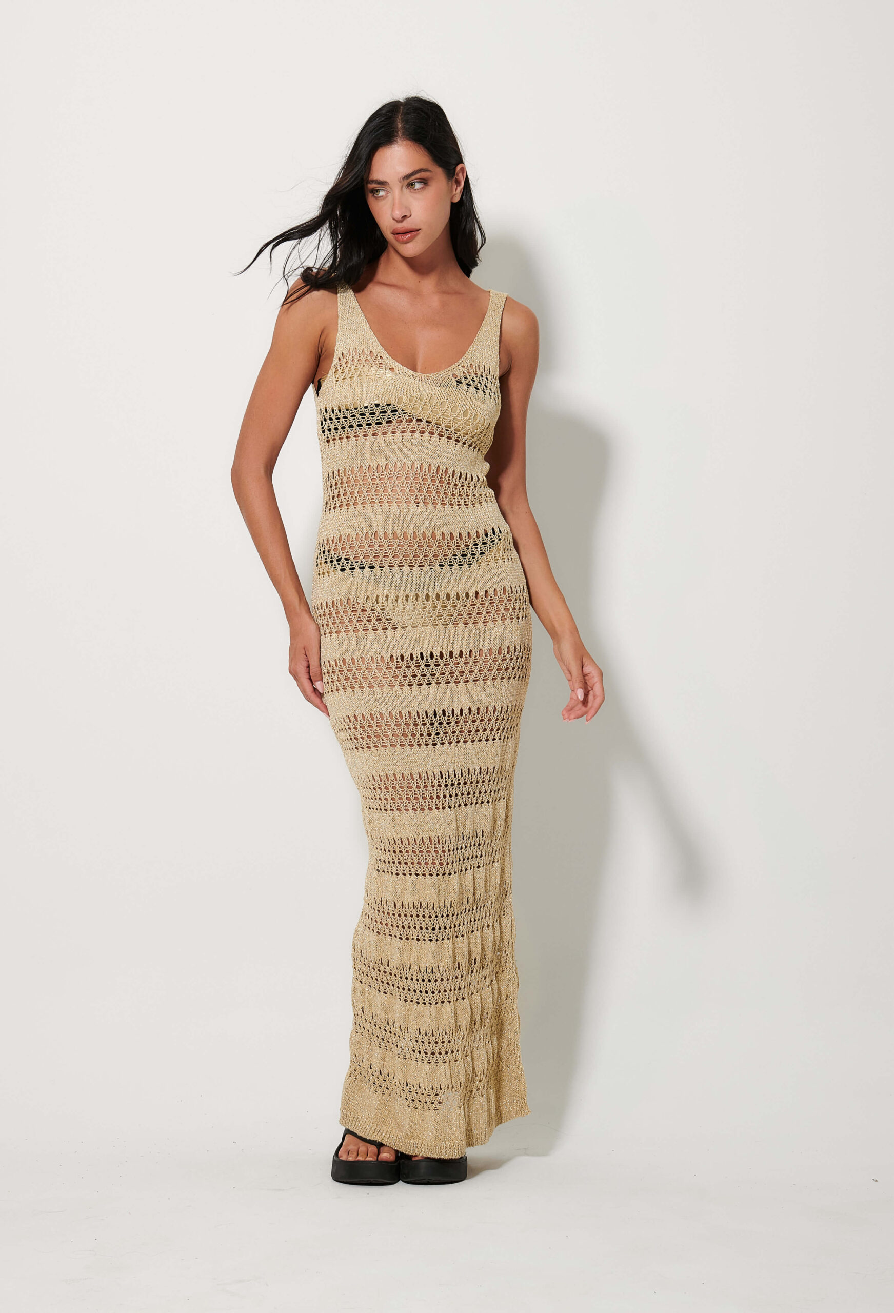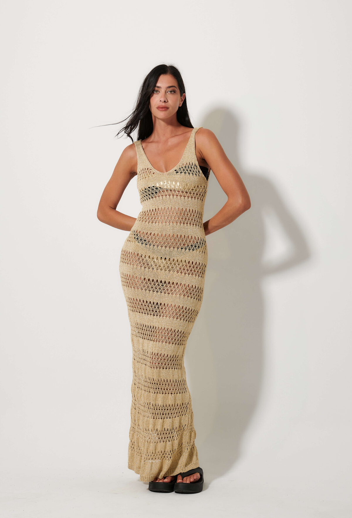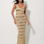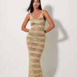 Γυναικείο χρυσό ριγέ πλεκτό φόρεμα καλοκαιρινό που χαρίζει κομψό και διακριτικά λαμπερό χαρακτήρα. Ιδανικό για casual ή βραδινές εμφανίσεις, φοριέται άνετα μόνο του ή με διακριτικά αξεσουάρ, δημιουργώντας ένα ολοκληρωμένο και προσεγμένο σύνολο.