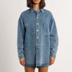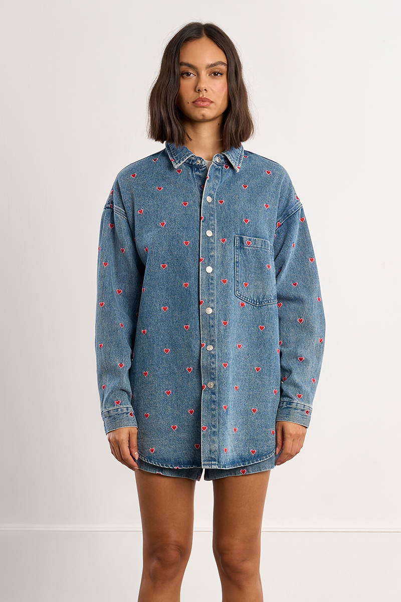Στυλάτο γυναικείο jean Πουκάμισο με σχέδιο καρδιές που προσθέτει παιχνιδιάρικο και μοντέρνο χαρακτήρα στο ντύσιμο. Διαχρονικός σχεδιασμός και άνετη εφαρμογή, ιδανικό για καθημερινές εμφανίσεις. Συνδυάζεται εύκολα με φορέματα, παντελόνια ή φούστες για ένα νεανικό και ξεχωριστό outfit.