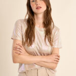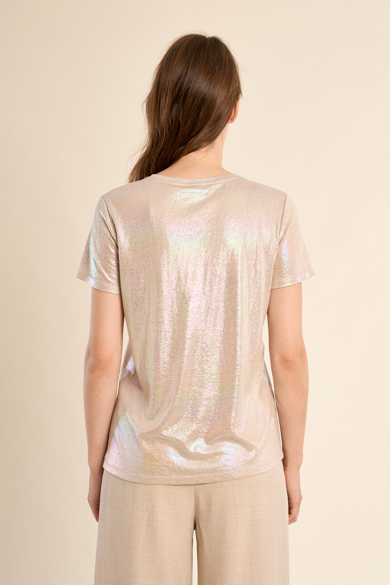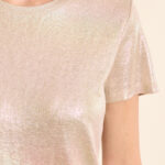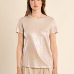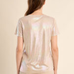 Αυτό το γυναικείο T-shirt ξεχωρίζει με το metallic φινίρισμά του, προσφέροντας άμεση λάμψη και μοντέρνο στυλ. Με άνετη γραμμή και θηλυκή εφαρμογή, είναι ιδανικό για βραδινές εμφανίσεις, parties ή για να δώσει ένα glam twist σε casual outfits, συνδυάζοντας άνεση και standout στυλ.