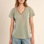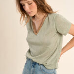 Το γυναικείο t-shirt πράσινο με χρυσή V λαιμόκοψη συνδυάζει άνεση και στυλ για casual εμφανίσεις. Η χρυσή λεπτομέρεια στη V λαιμόκοψη προσθέτει κομψότητα, ενώ το μαλακό ύφασμα χαρίζει άνεση.