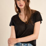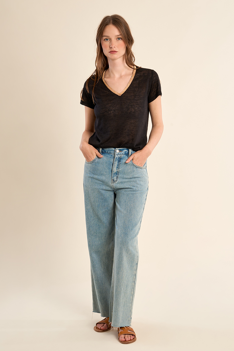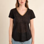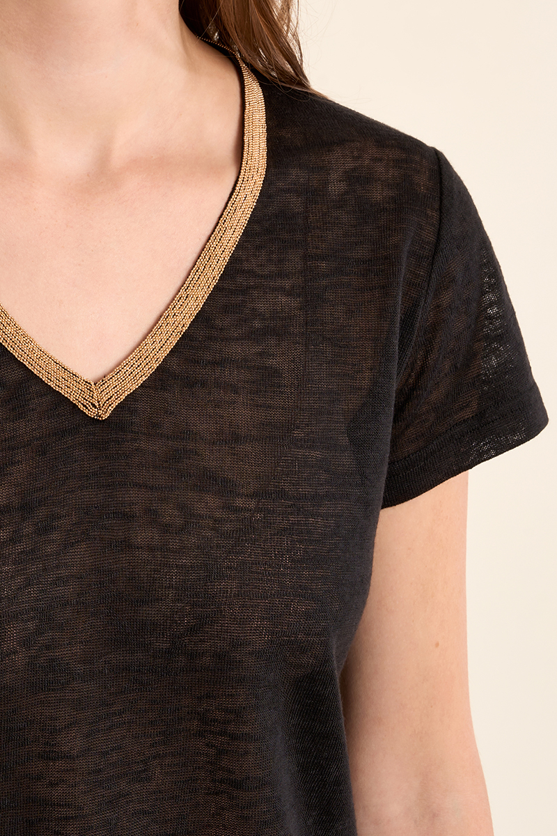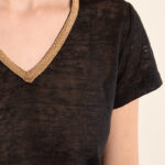 Το γυναικείο t-shirt μαύρο με χρυσή V λαιμόκοψη είναι κομψό και διαχρονικό. Η χρυσή λεπτομέρεια στη V λαιμόκοψη προσθέτει στυλ, ενώ το άνετο ύφασμα εξασφαλίζει καθημερινή άνεση.