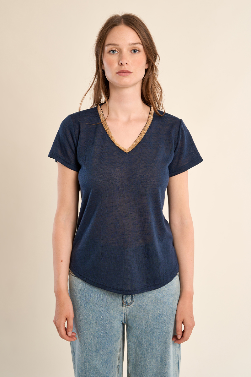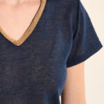 Το γυναικείο t-shirt μπλε με χρυσή V λαιμόκοψη είναι κομψό και άνετο για καθημερινές εμφανίσεις. Η V λαιμόκοψη με χρυσή λεπτομέρεια δίνει διακριτική λάμψη, ενώ το μαλακό ύφασμα χαρίζει άνεση.