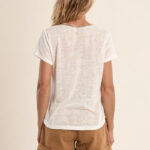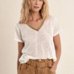 Το γυναικείο t-shirt άσπρο με χρυσή V λαιμόκοψη είναι κομψό και άνετο για καθημερινές εμφανίσεις. Η V λαιμόκοψη με χρυσή λεπτομέρεια προσθέτει διακριτική θηλυκότητα, ενώ το μαλακό ύφασμα εξασφαλίζει άνεση όλη την ημέρα.