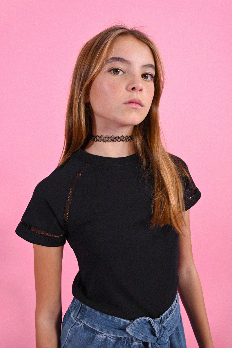 Κοντομάνικο μαύρο μπλουζάκι που προσφέρει κομψή και παιχνιδιάρικη εμφάνιση. Ιδανικό για καθημερινές δραστηριότητες και χαλαρές βόλτες, εύκολο στο συνδυασμό με άλλα ρούχα και αξεσουάρ για ολοκληρωμένο look.