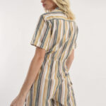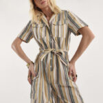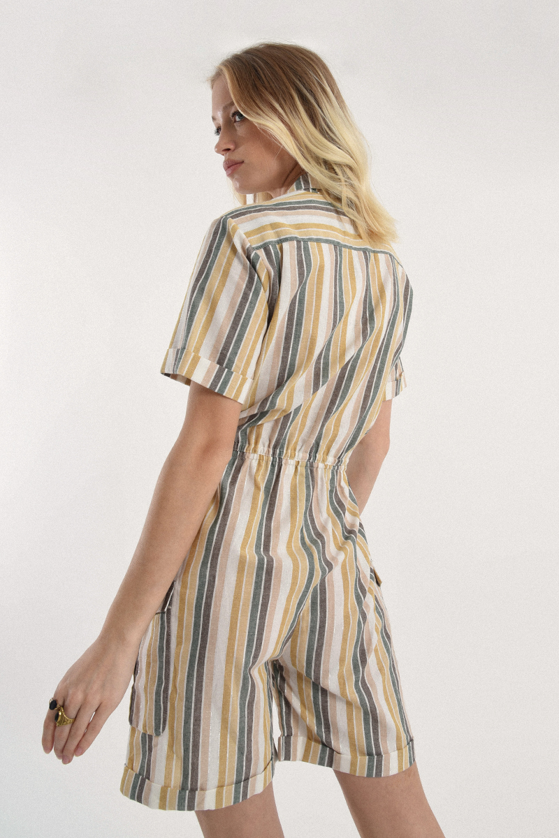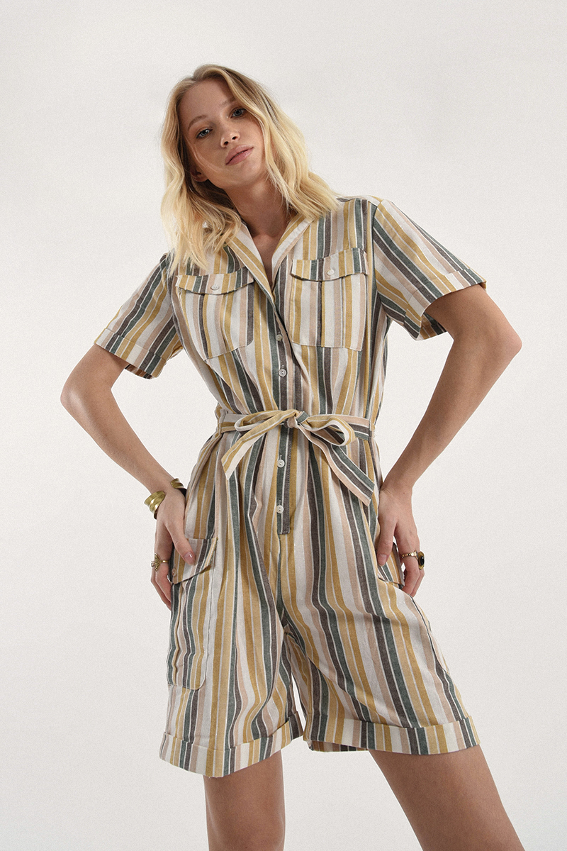 Ολόσωμο κοντομάνικο ριγέ με πρακτικές τσέπες, άνετο και ευκολοφόρετο. Ιδανικό για καθημερινές εμφανίσεις, προσφέρει δροσερό και χαλαρό στυλ. Μπορεί να συνδυαστεί εύκολα με αξεσουάρ για ένα ολοκληρωμένο και μοντέρνο look.