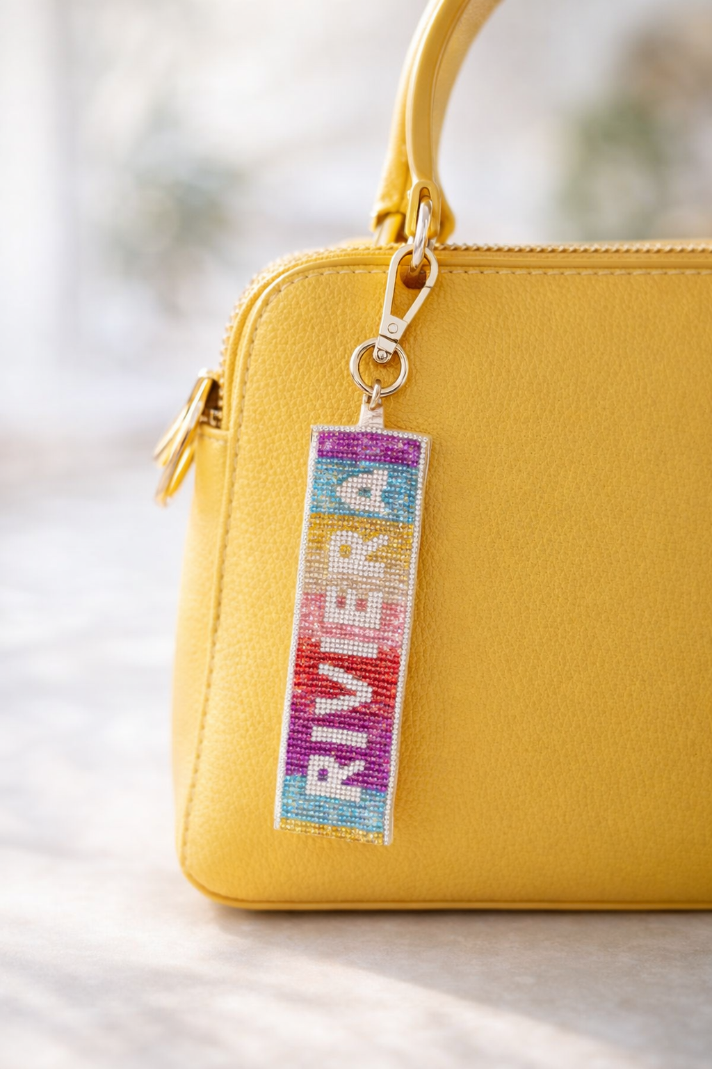 Πολύχρωμο μπρελόκ με την επιγραφή “Riviera” που χαρίζει παιχνιδιάρικο και καλοκαιρινό χαρακτήρα. Ιδανικό για τα κλειδιά ή για να στολίσετε τσάντες και αξεσουάρ, προσθέτοντας στυλ και χρώμα σε κάθε σύνολο.