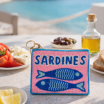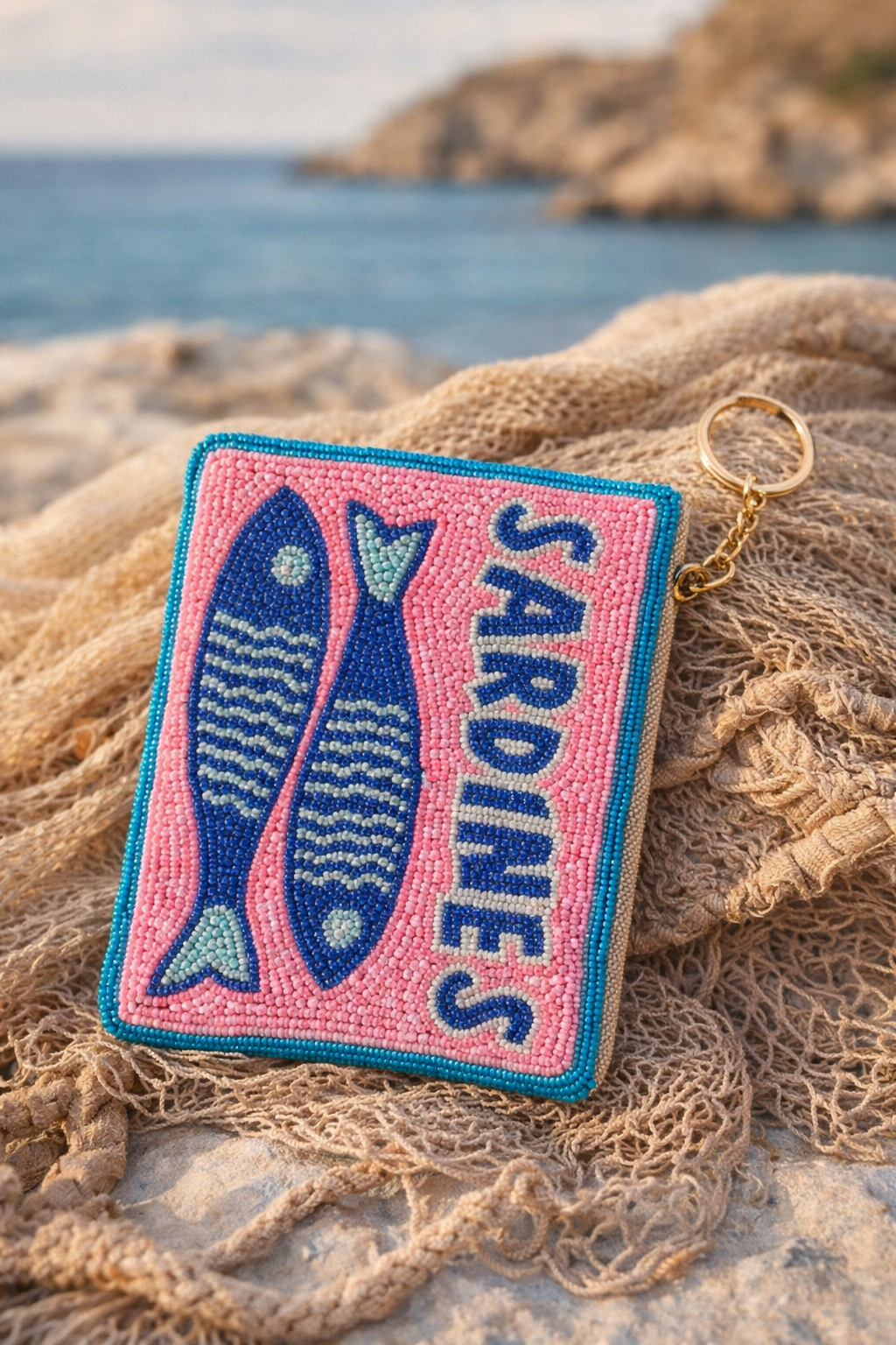 Πολύχρωμο πορτοφολάκι με σχέδιο σαρδέλες, κεντημένο με χάντρες για ξεχωριστό και παιχνιδιάρικο αποτέλεσμα. Ιδανικό για καθημερινή χρήση ή καλοκαιρινές εξορμήσεις, χωράει τα απαραίτητα και προσθέτει χρώμα και στυλ σε κάθε σύνολο.