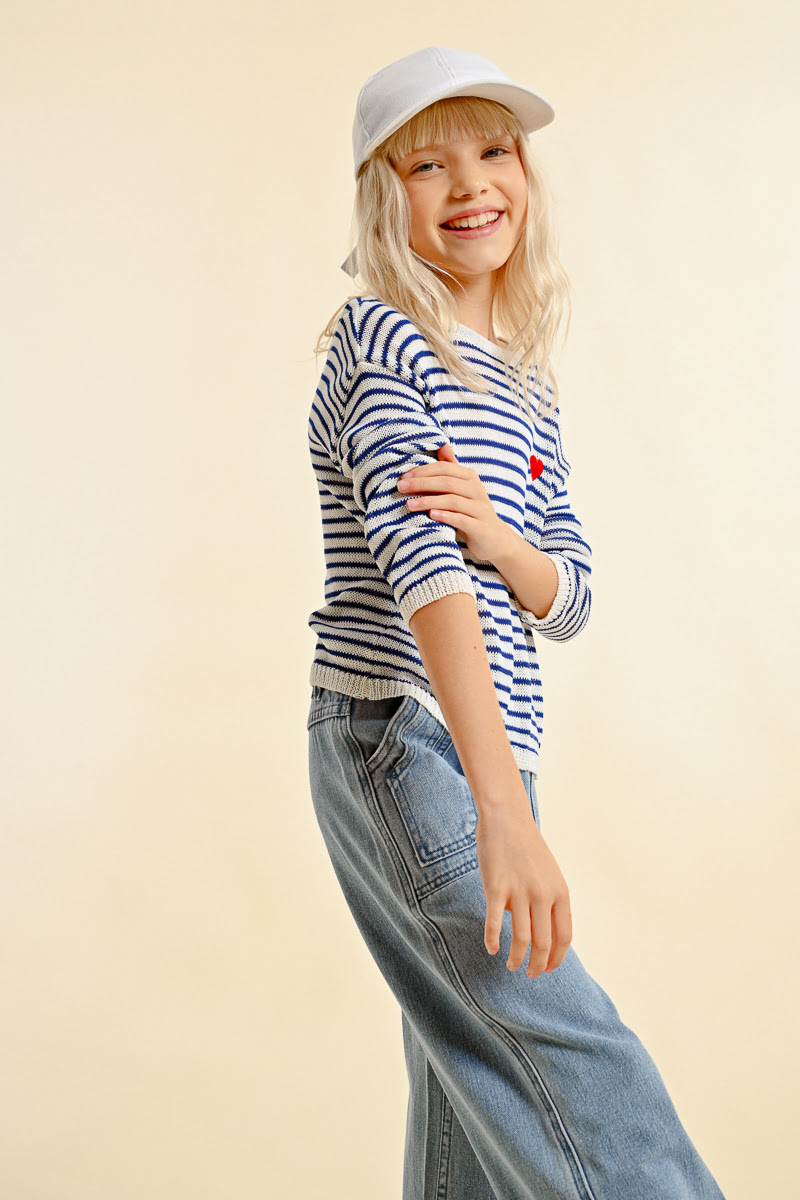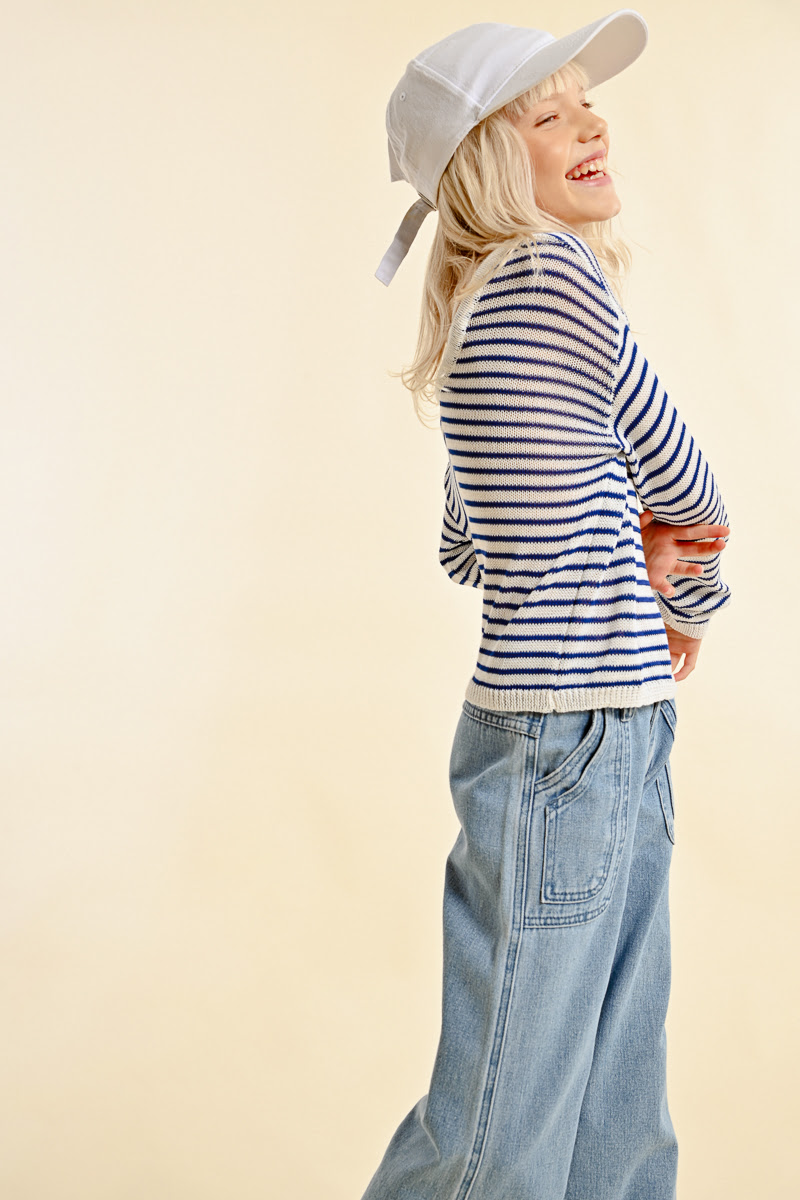 Ριγέ μακρυμάνικη μπλούζα σε λευκό-μπλε, με ιδιαίτερη λεπτομέρεια στην πλάτη. Άνετη και πρακτική για παιδιά, ιδανική για καθημερινό παιχνίδι και δραστηριότητες. Φοριέται εύκολα από το πρωί έως το βράδυ, προσφέροντας στυλ και ξεχωριστή εμφάνιση σε κάθε σύνολο.