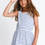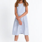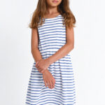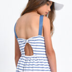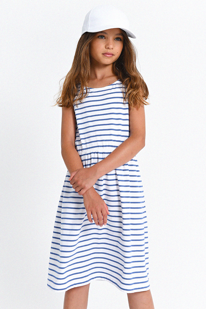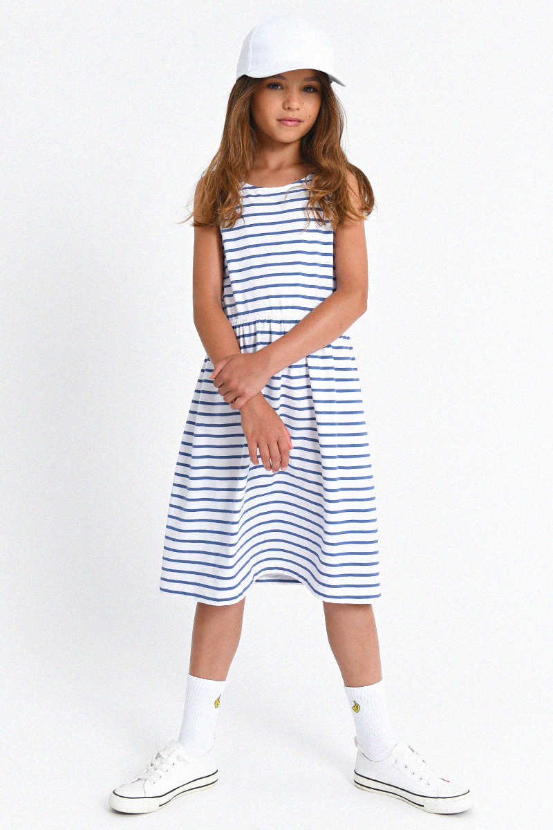 Ριγέ φόρεμα σε λευκό-μπλε με ιδιαίτερο σχέδιο στην πλάτη. Άνετη επιλογή για παιδιά, ιδανική για παιχνίδι και καθημερινές δραστηριότητες. Φοριέται εύκολα από το πρωί έως το βράδυ και προσφέρει ξεχωριστό στυλ σε κάθε εμφάνιση.