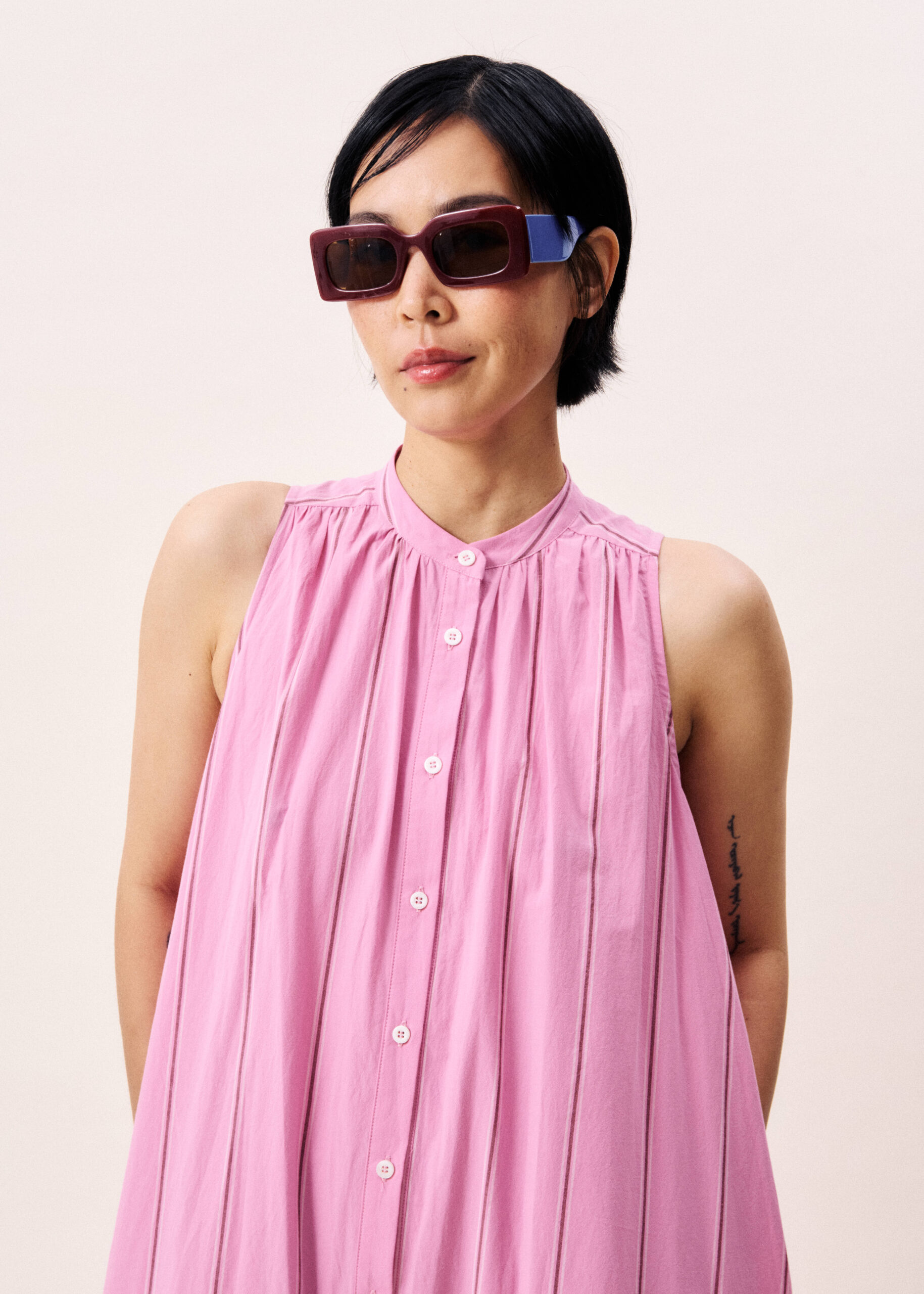 Κοντό φόρεμα σε φαρδιά γραμμή, με μανίκια 3/4 , κλείσιμο με κουμπιά και σε γεωμετρικό print