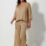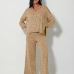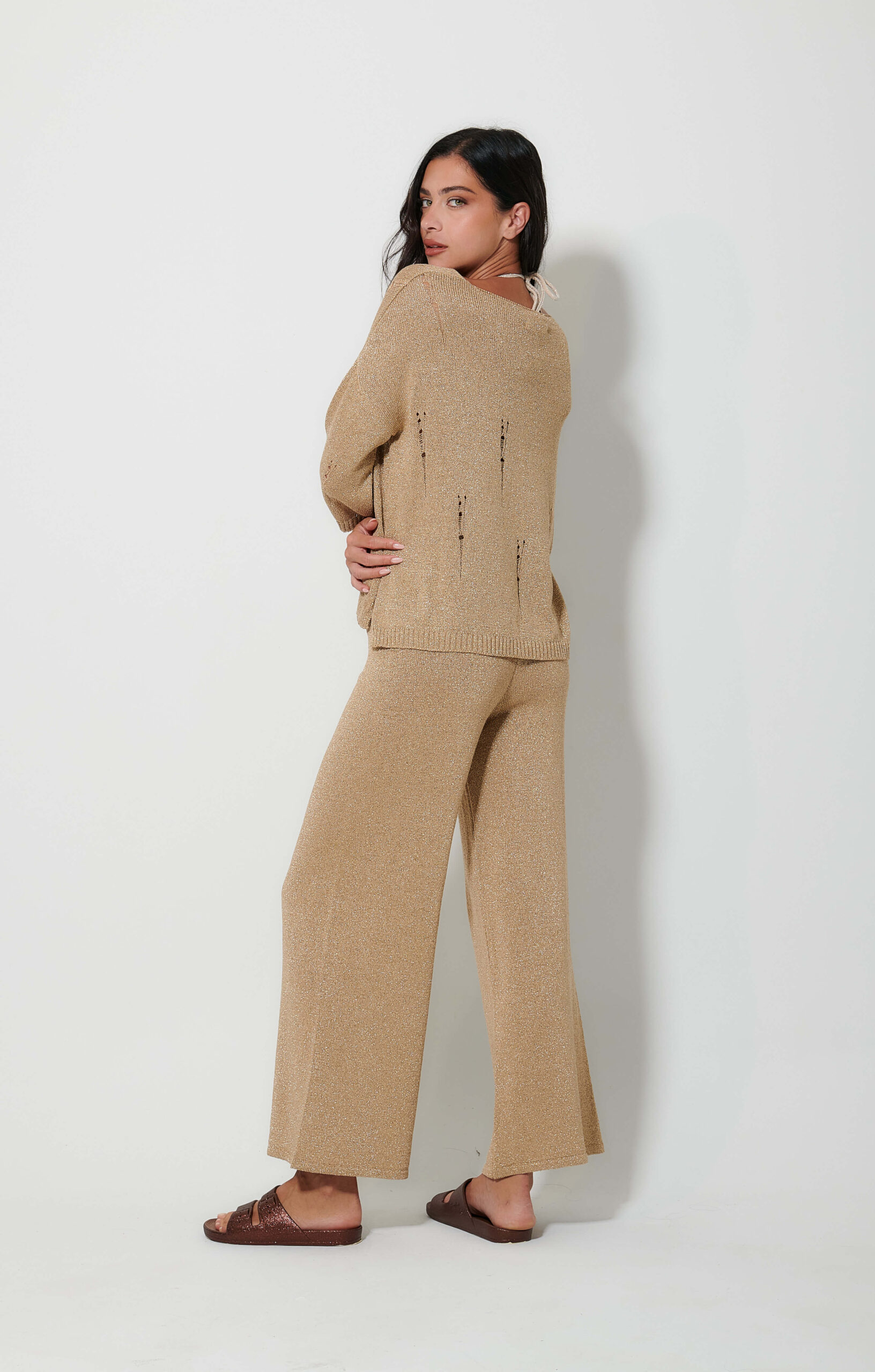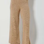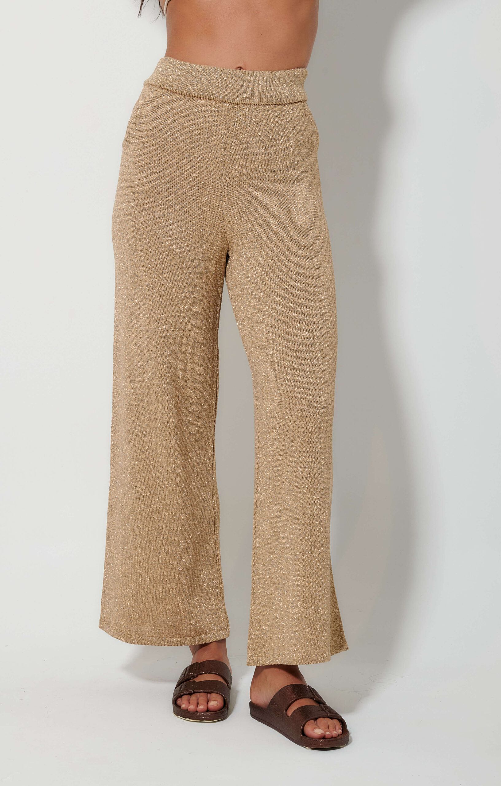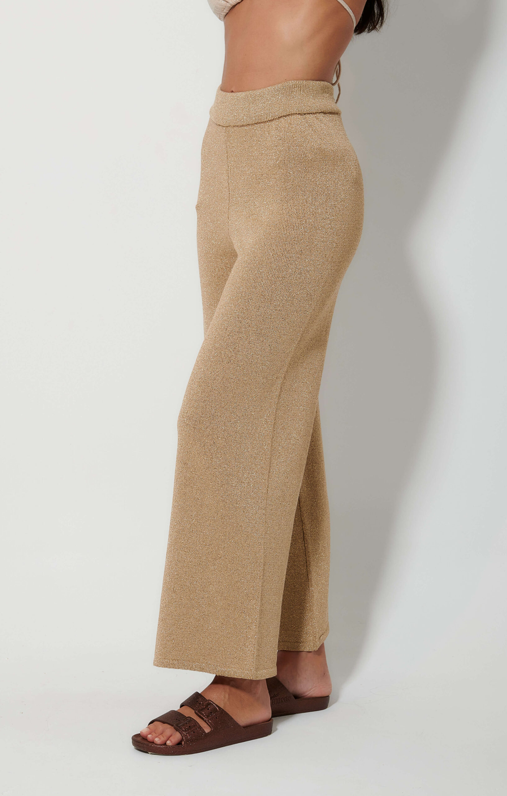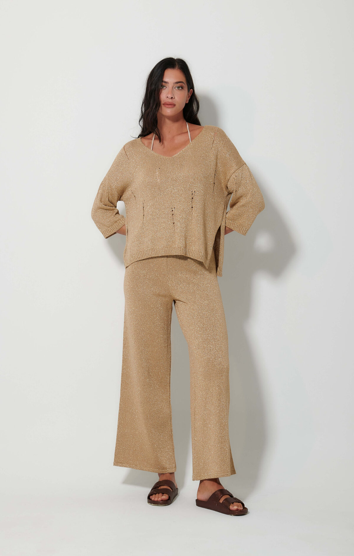 Γυναικείο χρυσό πλεκτό ψηλόμεσο παντελόνι που προσδίδει κομψό και διακριτικά λαμπερό χαρακτήρα στο ντύσιμο. Ιδανικό για casual ή βραδινές εμφανίσεις, φοριέται άνετα με μπλούζες, τοπ ή πουκάμισα, δημιουργώντας ένα ολοκληρωμένο και προσεγμένο σύνολο.