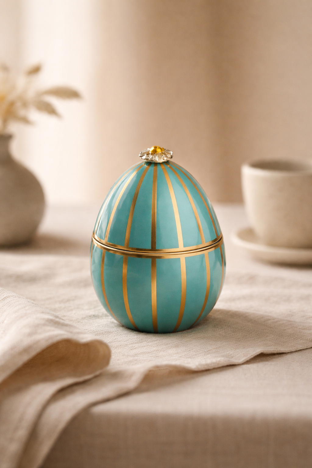 Ένα αρωματικό κερί με τιρκουάζ σχέδιο αυγού και χρυσές ρίγες. Κατασκευασμένο από κεραμικό και ζωγραφισμένο στο χέρι με χρυσό 18 καρατίων, στρας και διακοσμητικές λεπτομέρειες, αποτελεί έναν πραγματικό θησαυρό που προσφέρει άρωμα εμπνευσμένο από το Bois de Russie.