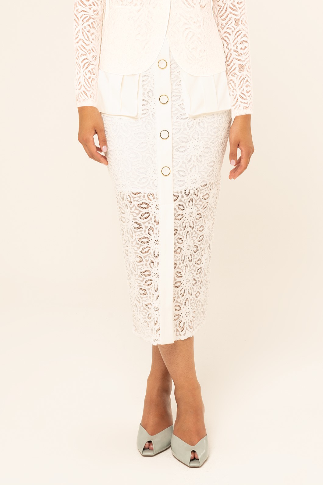 Αυτή η midi φούστα σε λευκή απόχρωση ξεχωρίζει με το εκλεπτυσμένο δαντελένιο ύφασμα και τα floral μοτίβα που προσδίδουν θηλυκότητα. Η λεπτομέρεια κουμπιών στο κέντρο μπροστά προσθέτει κομψό στυλ, ενώ το ημιδιάφανο κάτω μέρος δημιουργεί ένα αέρινο και εντυπωσιακό αποτέλεσμα, ιδανικό για ξεχωριστές εμφανίσεις και ανοιξιάτικες ή καλοκαιρινές συνθέσεις.