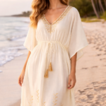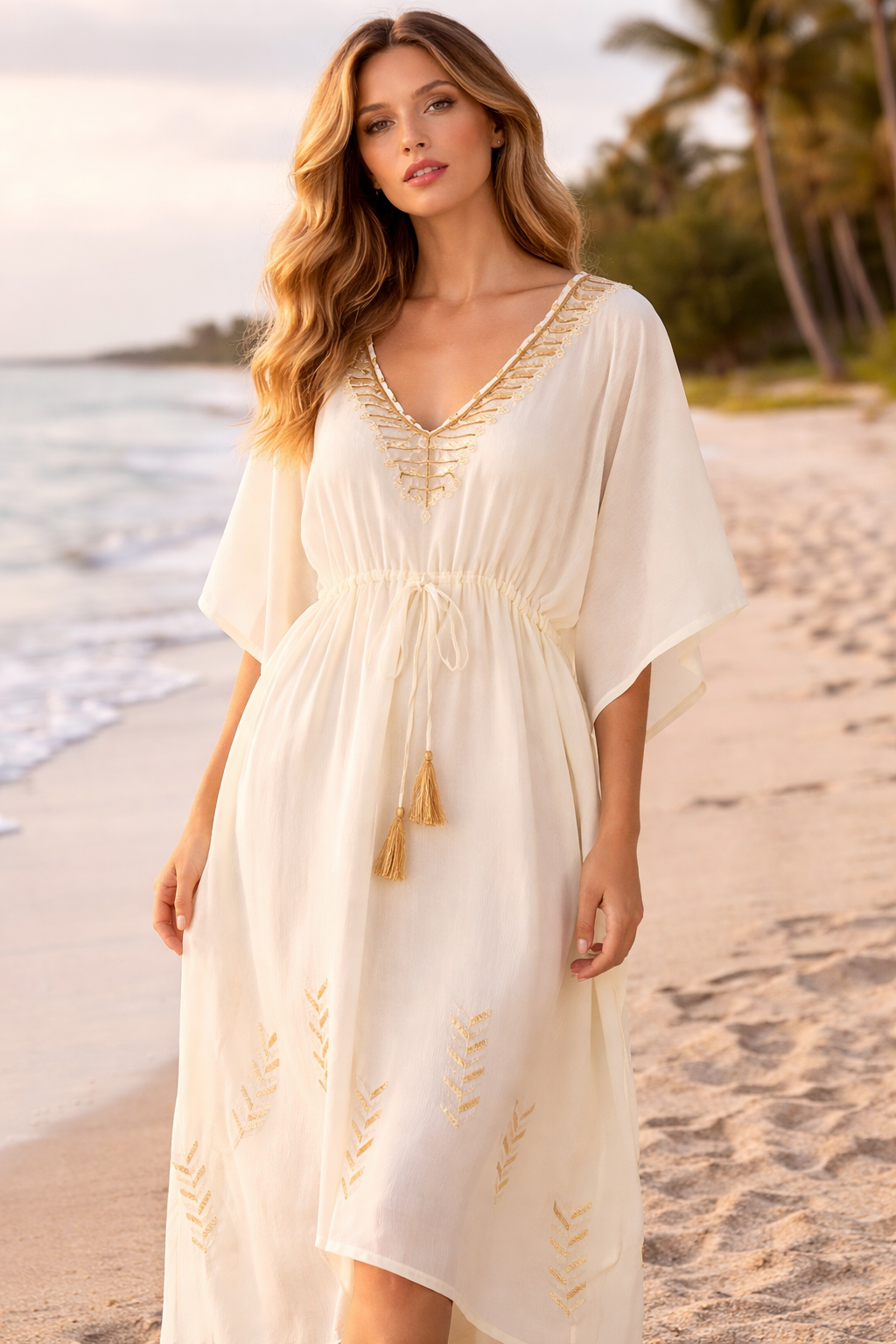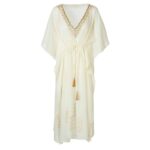 One of our favourite style of kaftans. It features a delicate fabric with print. Wear it in the city, at a festival or on holiday by the beach.